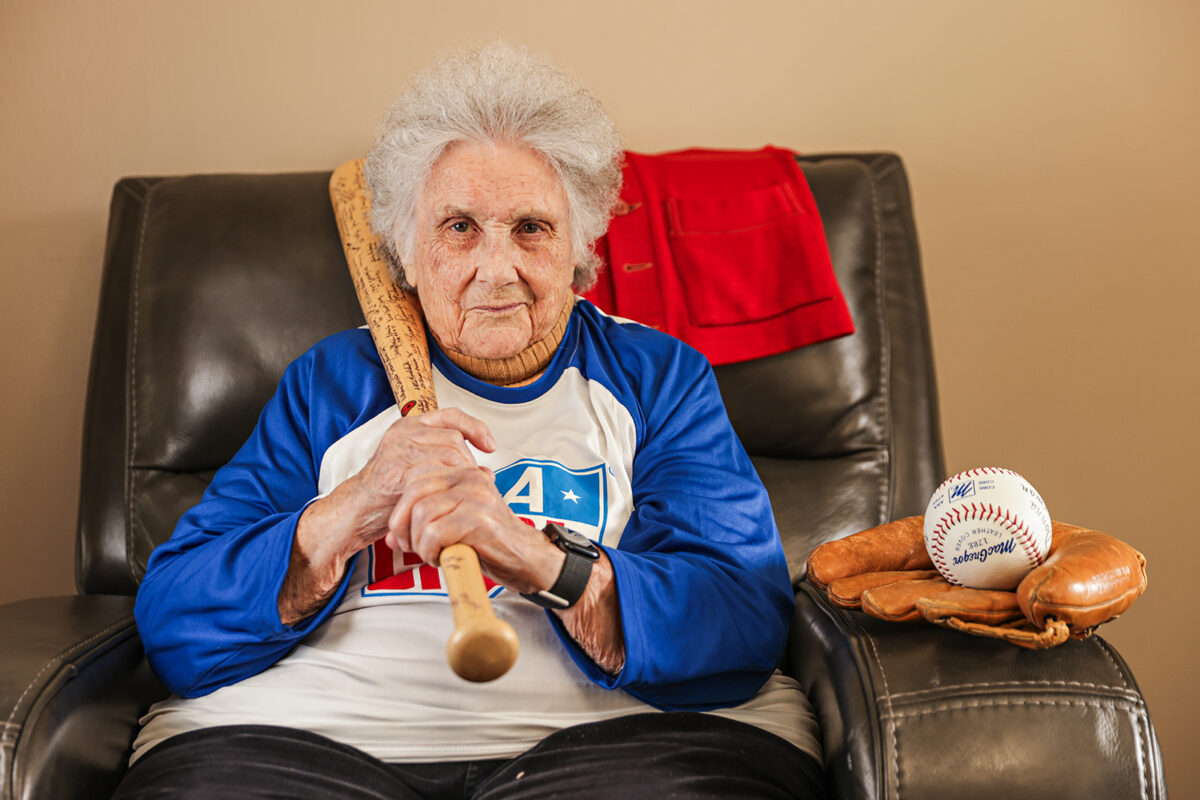 Donna Roberts, age 99, is pictured with her baseball memorabilia at her daughter’s home in Frenchtown on Nov. 1, 2025. Roberts, then Stageman, played in the All-American Girls Professional Baseball League, which existed from 1943 to 1954. Hunter D’Antuono | Flathead Beacon