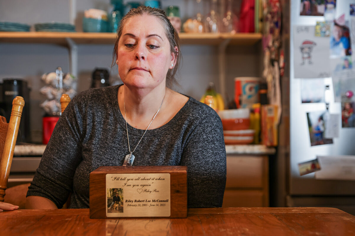 Evermay Mitchell sits with a wooden urn containing the ashes of her son Riley McConnell in her Kalispell home on Dec. 15, 2025. McConnell, age 20, died from a fentanyl overdose on June 14, 2025. Hunter D’Antuono | Flathead Beacon