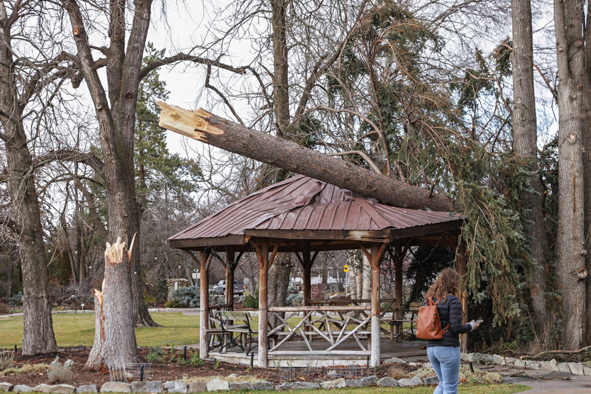 A tree toppled by a windstorm crushed the roof of the Conrad Mansion’s gazebo in Kalispell on Dec. 17, 2025. Hunter D’Antuono | Flathead Beacon