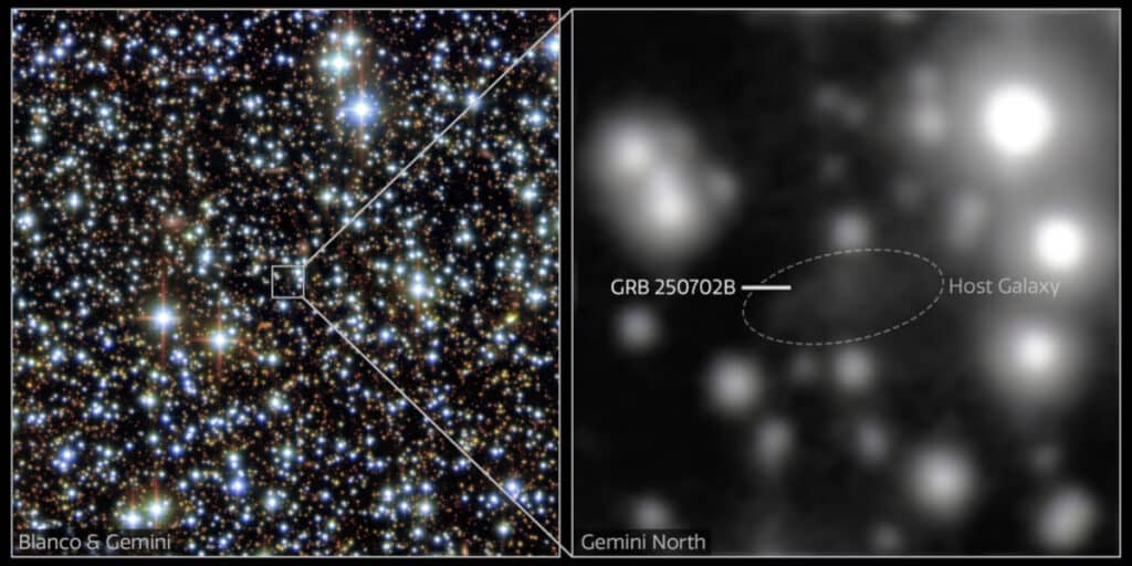 The image on the left shows the star field around the host galaxy of GRB 250702B. It combines observations from the Gemini North telescope in Hawaii and the Dark Energy Camera (DECam), installed on the 4-meter Víctor M. Blanco telescope at the Cerro Tololo Inter-American Observatory in Chile. On the right: a close-up of the host galaxy, taken with the Gemini North telescope. This image, which covers 9.5 arcseconds, is the result of more than two hours of observations. The host galaxy is barely visible, however, due to the thick layer of dust surrounding it. The optical and near-infrared data from DECam were acquired on July 3, while the near-infrared observations from Gemini North were made on July 20. © Gemini International Observatory/CTIO/NOIRLab/DOE/NSF/AURA. Image processing: M. Zamani and D. de Martin (NSF NOIRLab)