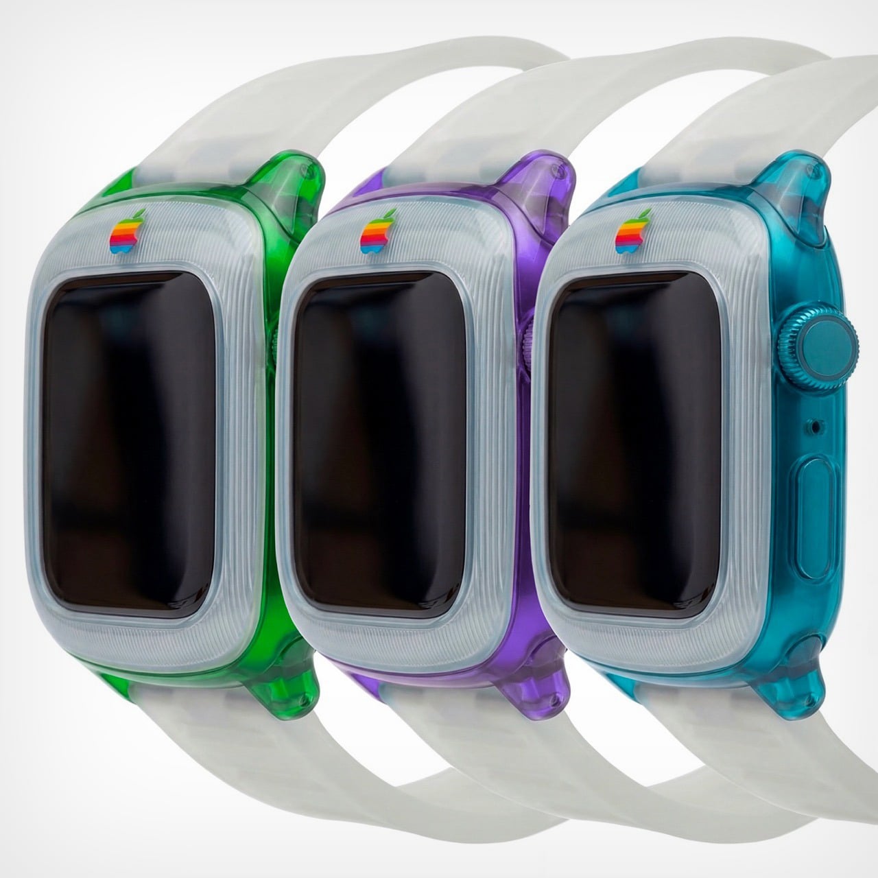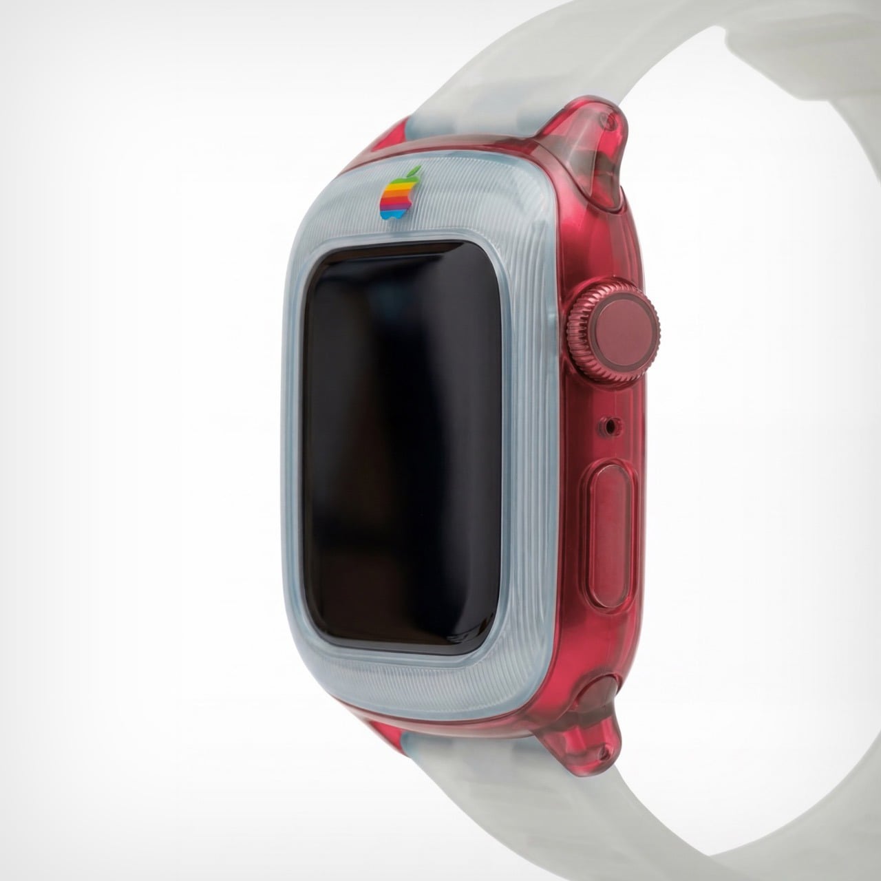 The G3 trend even carries to the Apple’s colored logo, which features on the bezel of the watch. It’s rare for the watch to have a logo on the front, but then again, it’s entirely inconceivable for Apple to make a plastic watch. But, like I said, a guy can dream! The colorful logo sits on the front, right above the standard touchscreen display with its curved glass almost perfectly mirroring the iMac G3’s CRT display.