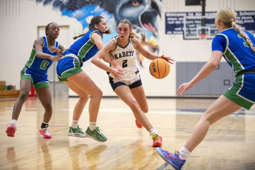Air Academy’s Kinley Asp (2) splits the defenders to drive the lane against Doherty’s Addie Zaiger (2), Sontee Keys (0), and Jada Symons (3) at Air Academy High School in Colorado Springs on Dec. 4. (Laura Domingue/ Special to The Gazette)