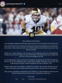 A 6-foot-4-inch, 260-pounder from Traverse City, Michigan, Burnham appeared in all 12 Notre Dame games during the 2025 season and 40 career games since he arrived as part of the Fighting Irish’s 2022 signing class.