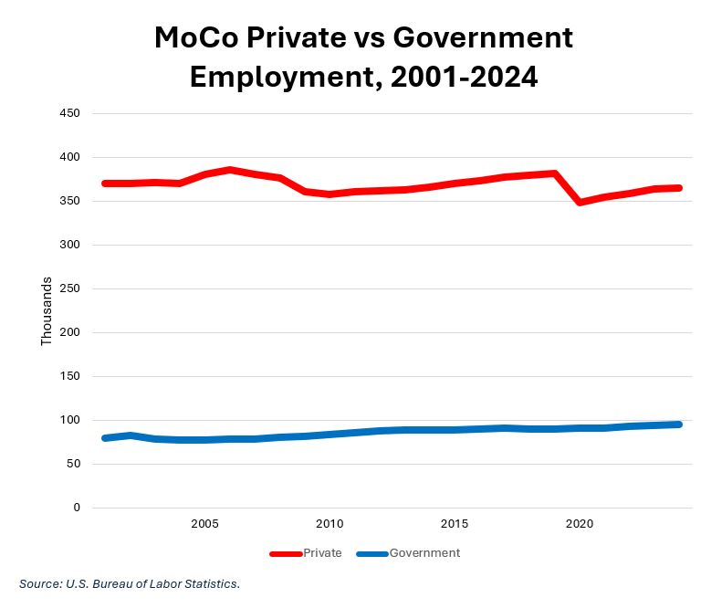 First, let’s look at private vs government employment in MoCo since 2001, the first year in the series. Private employment has varied with the business cycle but it has fallen from 370,125 in 2001 to 365,667 in 2024, a drop of 1.2%. Meanwhile, government employment has grown from 79,756 in 2001 to 95,187 in 2024, an increase of 19.3%. As its private sector has stagnated, MoCo is becoming increasingly dependent on government for its jobs base.
