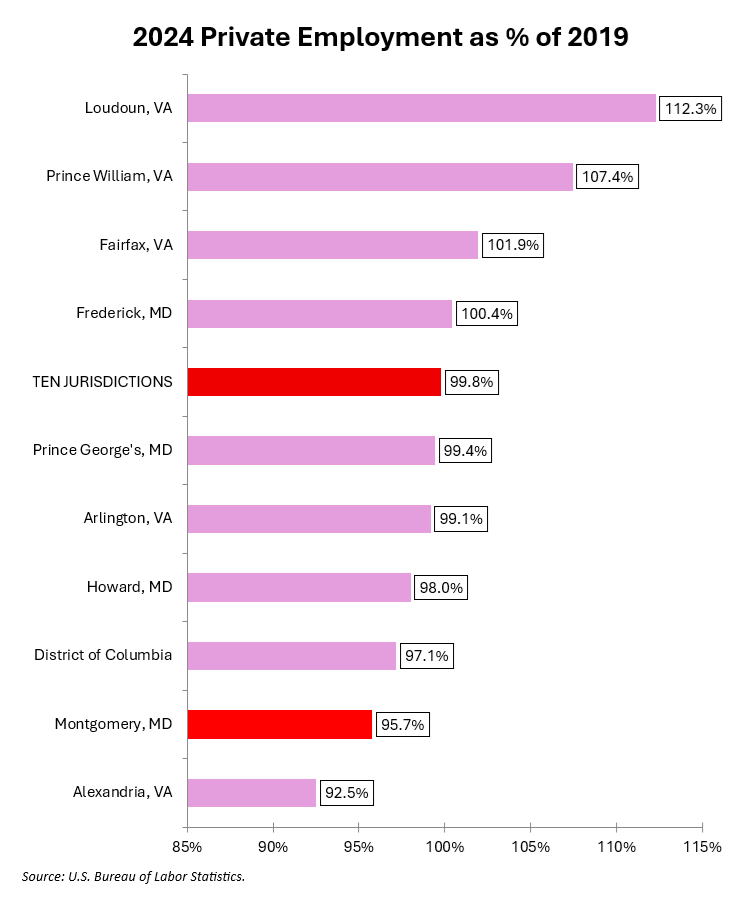 The chart below shows 2024 private employment as a percentage of 2019 total employment. This measures the degree to which each jurisdiction has bounced back from the pandemic.