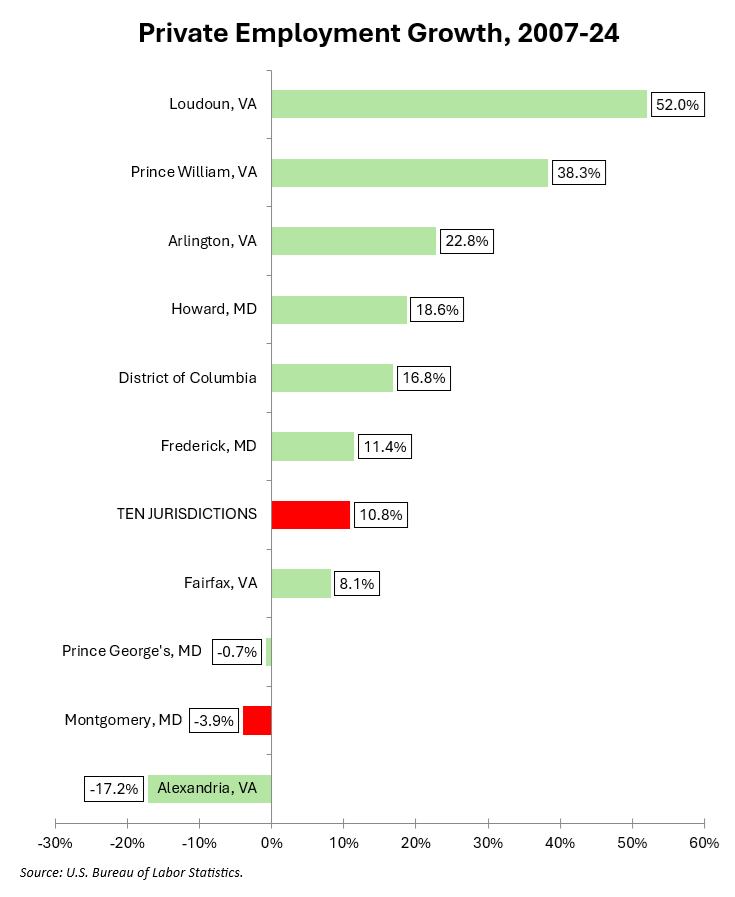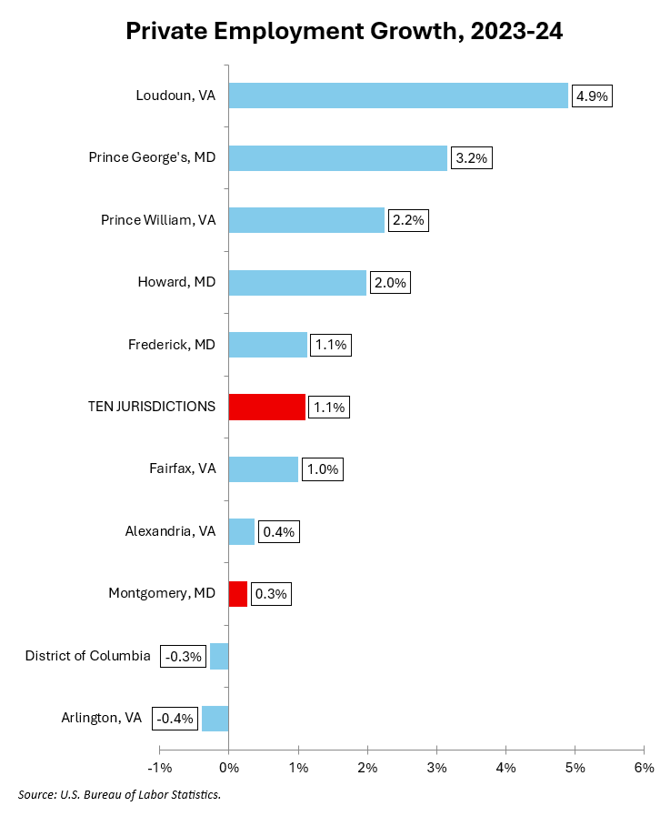 The chart below shows one-year growth of private employment in 2024 for MoCo and the other nine large jurisdictions in the region.