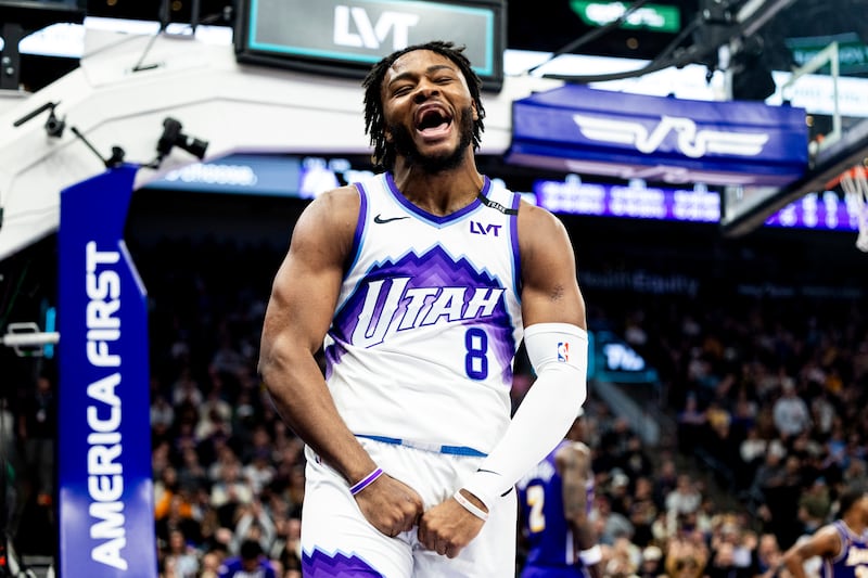 Isaiah CollierUtah Jazz guard Isaiah Collier (8) celebrates after he was fouled on his made basket during an NBA game against the Los Angeles Lakers held at the Delta Center in Salt Lake City on Thursday, Dec. 18, 2025. Shortly after, Collier made the foul shot to complete a three-point play. | Isaac Hale, Deseret News