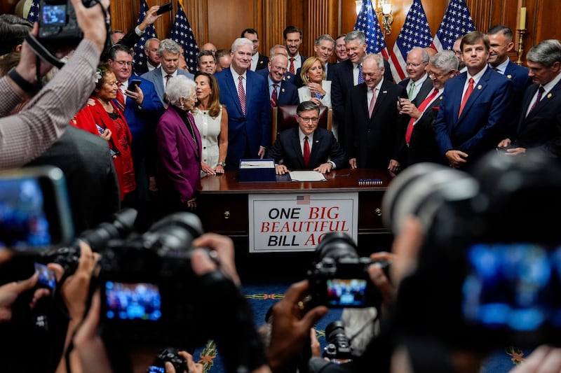 The ‘One Big Beautiful Bill’ Speaker of the House Mike Johnson, R-La., surrounded by Republican members of Congress, signs President Donald Trump’s signature bill of tax breaks and spending cuts, Thursday, July 3, 2025, at the Capitol in Washington. | Julia Demaree Nikhinson, Associated Press