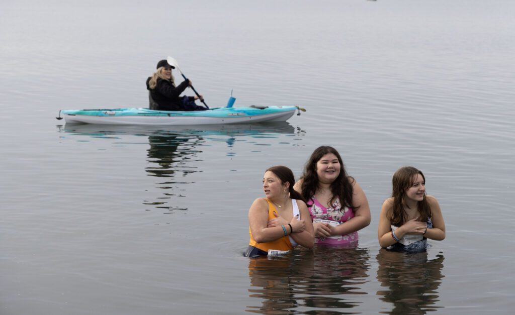 Kinley Ebbesen, 13, Kyla Garcia, 13, and Teagan Lutjemeier, 14, wait to be the last ones out of the water. (Andy Bronson/Cascadia Daily News)