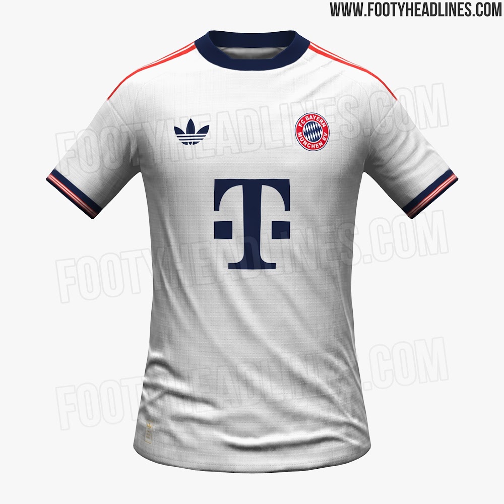 Away Kit: Bayern’s away kit for 2026-27 comes in white and navy as the primary colors, featuring the Trefoil logo in place of the standard three stripes.