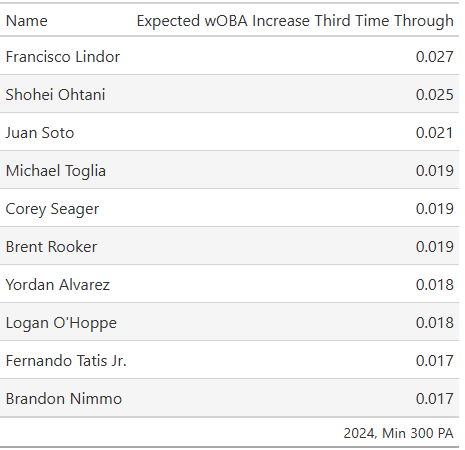 As mentioned, Lindor leads the way, with a 0.027 expected wOBA improvement the third time through relative to his first time facing that pitcher. Followed closely behind was Shohei Ohtani, with Juan Soto, Michael Toglia, and Corey Seager coming right after. If you scanned this list you’d notice not only some of the best hitters in baseball, but also guys who are known for having exceptional eyes and approaches. Juan Soto and Corey Seager in particular are known for these qualities, with the latter even getting his own stat named after him. Additionally, a scan of the guys at the bottom reveals the opposite: below average hitters and those with below-average approaches.