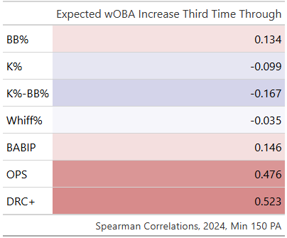 This was a somewhat familiar sequence for Lindor, who in 2024 saw the most improvement of any batter in baseball, the batter equivalent of the Times Through the Order Penalty (TTOP). It’s a skill that not only exists, but is as sticky year to year as a hitter’s BABIP and is positively correlated both to one’s overall skill as a hitter and specifically to one’s plate discipline. This discovery was prompted by a message from Davy Andrews of FanGraphs in response to a piece I wrote in February. In that research I found the Times Through the Order Penalty for pitchers was primarily due to familiarity rather than to fatigue, and that familiarity came both through a batter’s familiarity with a specific offering from the pitcher and from the pitcher as a whole. After it was published Davy reached out to me with an interesting question: If TTOP is primarily due to familiarity, then shouldn’t we see some variance among hitters in their ability to “learn” a pitcher? And if we do, then what other skills might this “TTOP skill” be associated with?