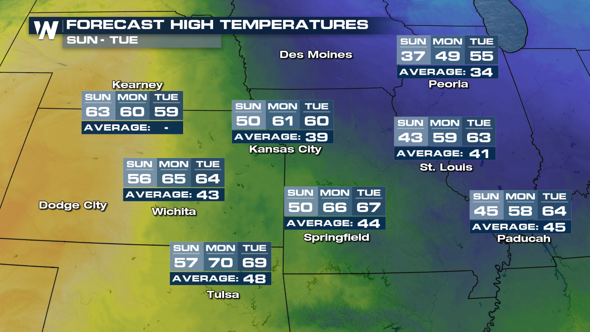 Check out these forecasted temperatures for next week! We’re looking at widespread highs of 20° or more above average by Tuesday!