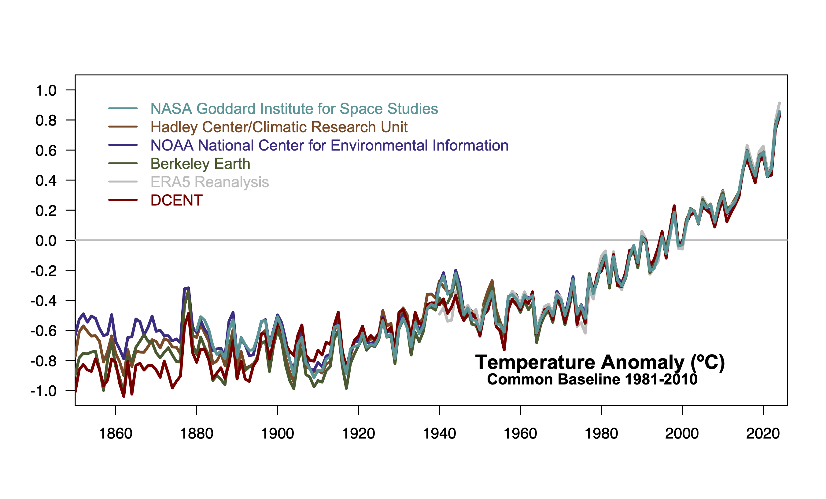 There are now at least four data sets that are regularly maintained and that go back to at least 1850: HadCRUT (currently v5.1), NOAA (v6), Berkeley Earth and, a relatively new effort, DCENT. They use different (though overlapping) raw data, different methods, and different interpolations, and thus (unsurprisingly) give different magnitudes of change since 1850-1900. With respect to their own baselines, 2024 was 1.45-1.65ºC above 1850-1900. If they are aligned in the modern period (when the differences between the methods/data are minimal), there is clearly a variation in both inferred interannual variability and mean change in the ‘pre-industrial’ period (see fig. 1). How should this be interpreted? It’s not the full structural uncertainty (since we are not really sampling all of the issues – particularly in the SST products), but it is perhaps a lower bound on that uncertainty. Ensembles that sample the methodological uncertainty are also useful, of course.