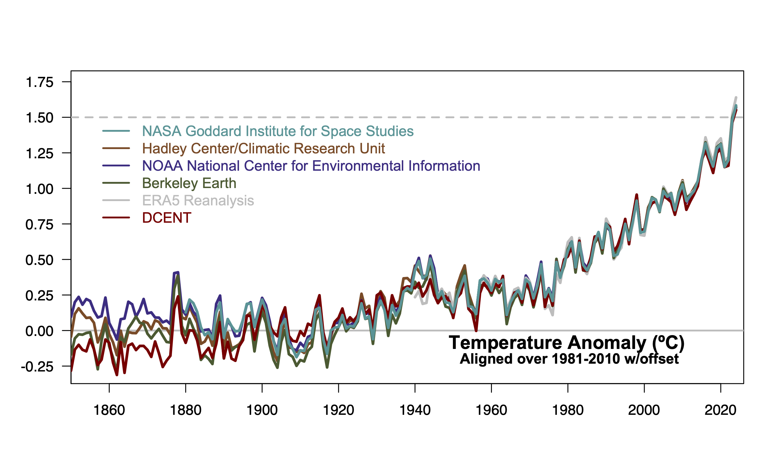Finally, given that all of these approaches rely on moving targets (which records are being maintained, raw data being added through data rescue efforts, updates to method versions etc.), one has the choice of either updating these calculations every year (which means you need to explain why things might change from previous years), or sticking to a canonical calculation (such as the one in AR6) for consistency. The best estimate of the annual offset from 1981-2010 to the 1850-1900 period was estimated as 0.69ºC in AR6, but following an analogous recipe now would give 0.73ºC (mainly because DCENT has a colder 19th C than the older products, and updates to HadCRUT and Berkeley Earth have shifted things slightly).