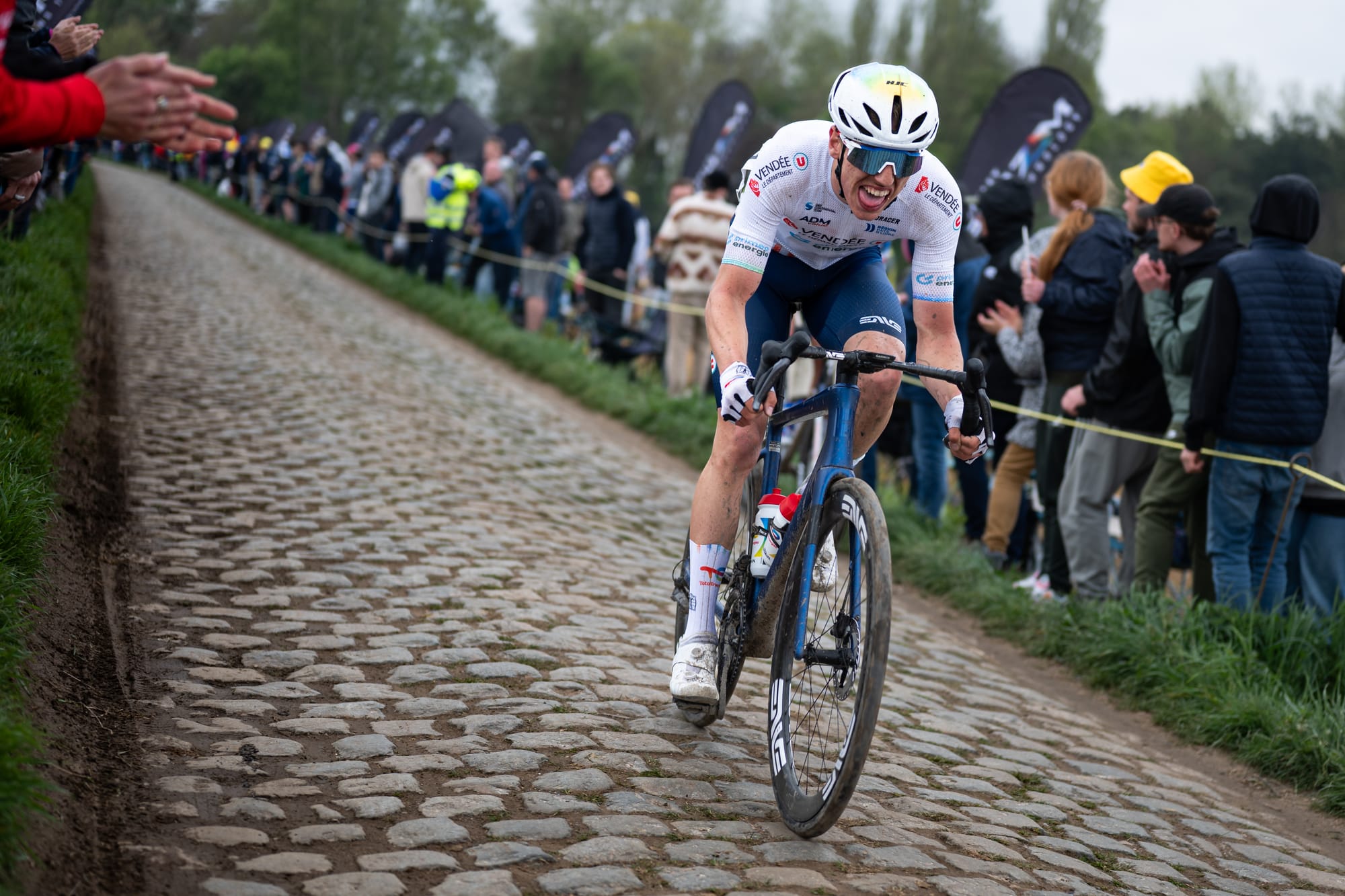 Crowds lined the Carrefour de l’Arbre hours before the elite race was due to arrive, with spectators settled in with camp chairs and bottles of wine to make a day of the racing. The Paris–Roubaix Espoirs, the under-23 men’s race, rolled past those crowds to loud support, with particularly enthusiastic cheers going towards those separated from groups and showing the pain of the effort on their faces. | Photo by Andrew Moss (@andymoss461)