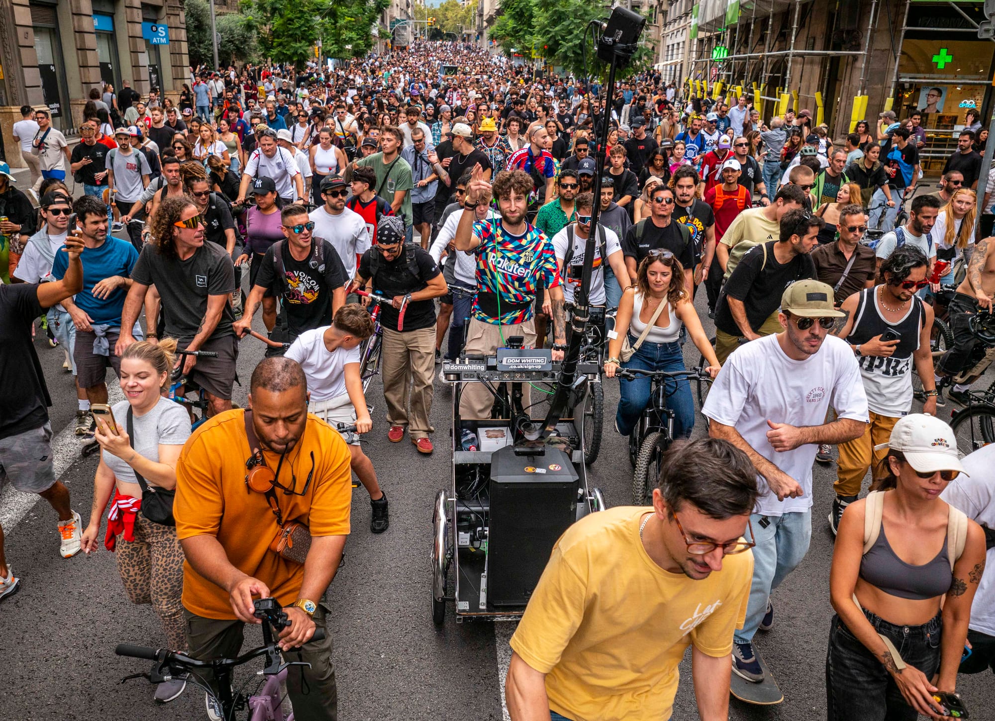 Dom Whiting has the ability to call and convene an enormous amount of people, riding bikes or not, and make them dance and enjoy while they are riding with him and his interesting setup. Dom started in 2020 to make music on his bike, mixing drum ‘n’ bass while riding. It’s a rave on wheels in constant movement, with thousand of riders and dancers enjoying his performance. | Photo by Xavi Calvo (@calvox)