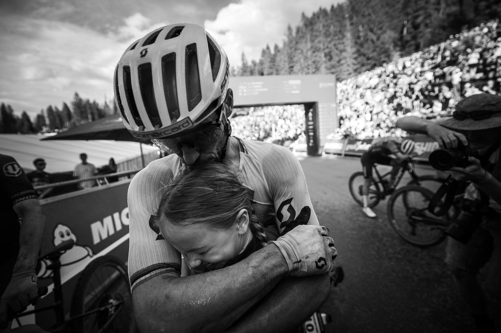 Legendary mountain bike rider Nino Schurter hugs his daughter right after he finished his truly exceptional career in front of home crowds in Lenzerheide, Switzerland. | Photo by Michal Cerveny (@michalcervenyphoto)