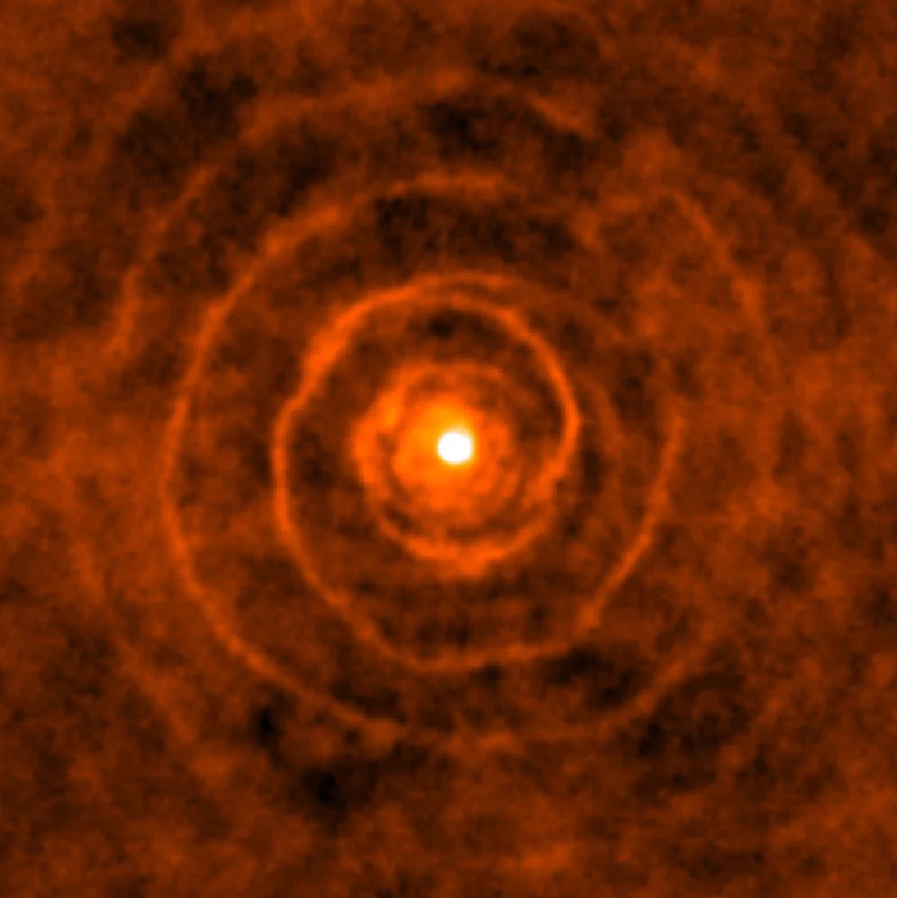 This ALMA image shows the carbon monoxide emissions from dust around an AGB star. The emissions reveal important information about AGB mass loss via stellar winds. It’s possible that a second generation of planets could form from the dust in AGB winds. Image Credit: ALMA/Kim et al. 2017, Nature Astronomy.