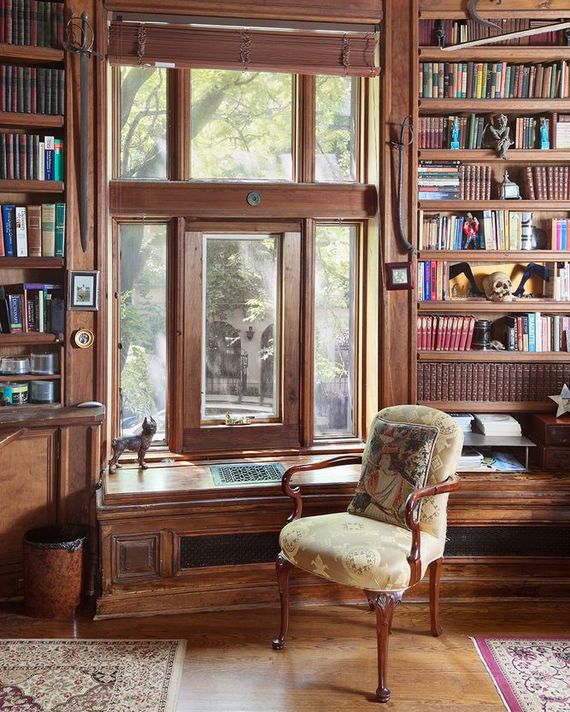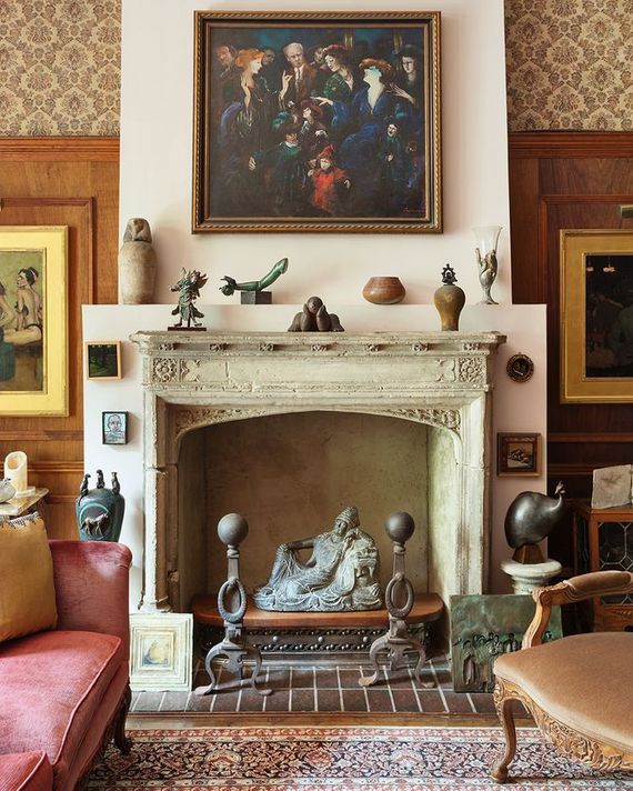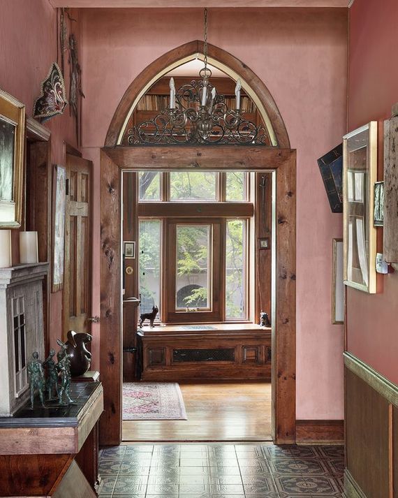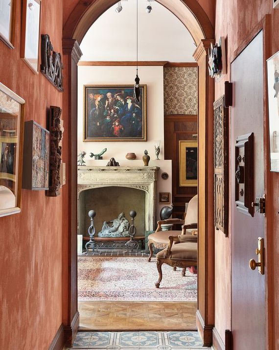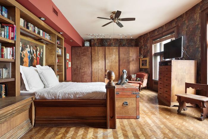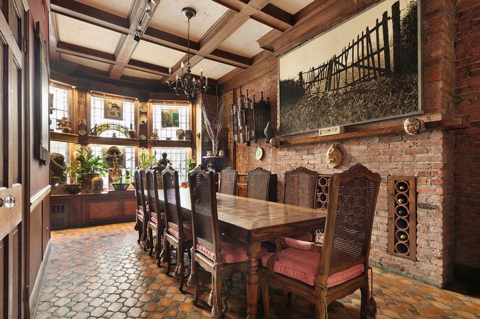 If renters stayed for years and years, that might have been due to their atypically generous landlords. Bill fixed up the roof to create a communal deck and garden with views over the river. The cellar included an art studio open to all. And hallways held the overflow of the couple’s personal collection, which included some Kiki Smiths. “We had art going up the whole six floors. The whole place was a gallery,” says Donna. But the showstopper was their personal home: a 3,000-square-foot two-bedroom apartment that revealed the true extent of Bill’s castle fantasy. They added parquet floors (by hand), put Gothic arches over doorways, and built out the primary bedroom with dark-wood shelving that made it feel more like a monk’s study than Bill’s office, which had views over leafy 80th Street. A panel in a wood-walled double-height living room popped open to reveal a secret cocktail bar, and curved terra-cotta roof tiles were built into the wall of the dining room to create an improvised wine rack. When they came up with the idea of concealing an airshaft with stained glass, Donna took a class at the YMCA and installed the glass herself. The staircase beside it is Bill’s ode to Donna; he wanted something grand enough for her to make an entrance. The couple decorated with period wallpaper and dark curtains, but they didn’t have Gilded Age sensibilities, and parties often included the renters. “All of our tenants were friends,” says Donna. “People were in and out my door constantly. The building was full of life.” Mark Jovanovic, a real-estate agent, started helping rent the units around 2005 and couldn’t turn down an invitation to Bill and Donna’s duplex. “After a showing, I would dedicate 40 minutes just to hear their stories,” he says.