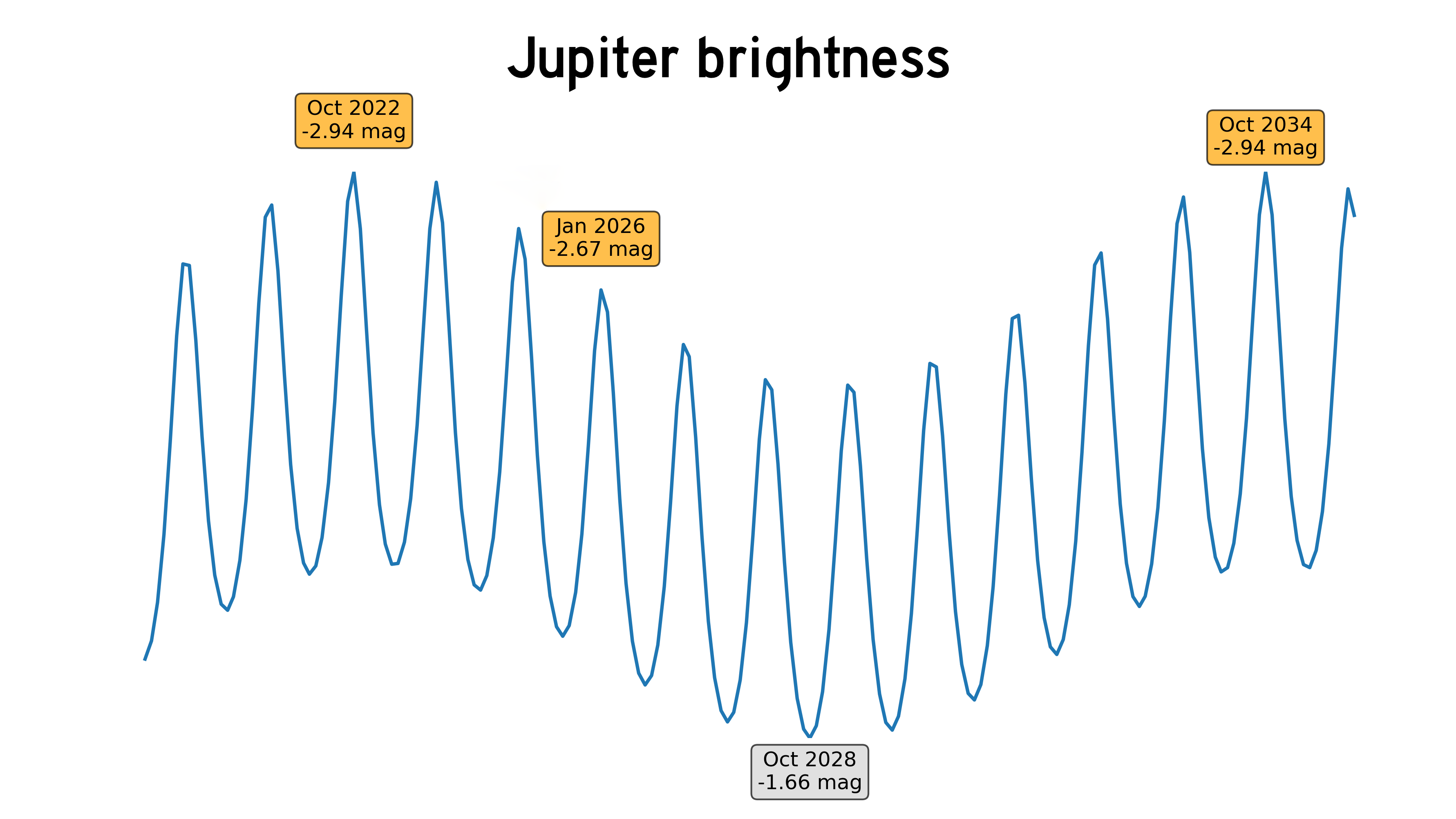 Jupiter shines at magnitude -2.67 this week, the brightest it will be until October 2034. It will be easy to spot in the eastern evening sky throughout the month,