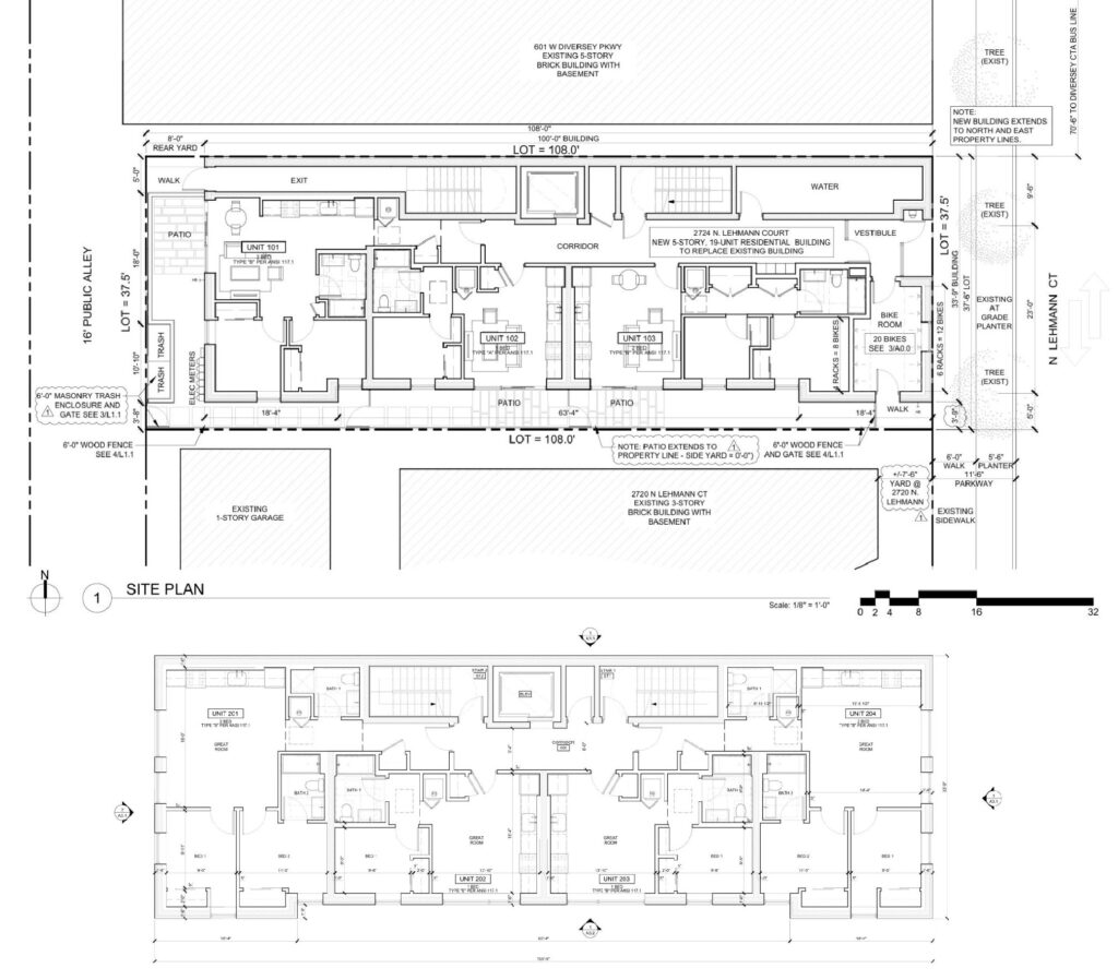 Plans have been revealed for a residential development at 2724 North Lehmann Court in Lincoln Park. Located just south of the intersection with West Diversey Parkway, the slim site previously held a three-story residential building, which was issued a demolition permit late last year. Once demolition is complete, developer Contemporary Concepts can move forward with construction plans.