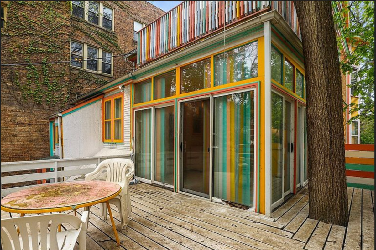 Every part of the Candyland House is brightly colored, including the deck table and shutters. Credit: Zillow
