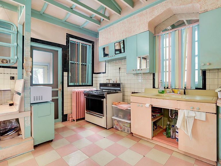 In the Candyland House, everything is pastel colored, including the blinds and radiator. Credit: Zillow