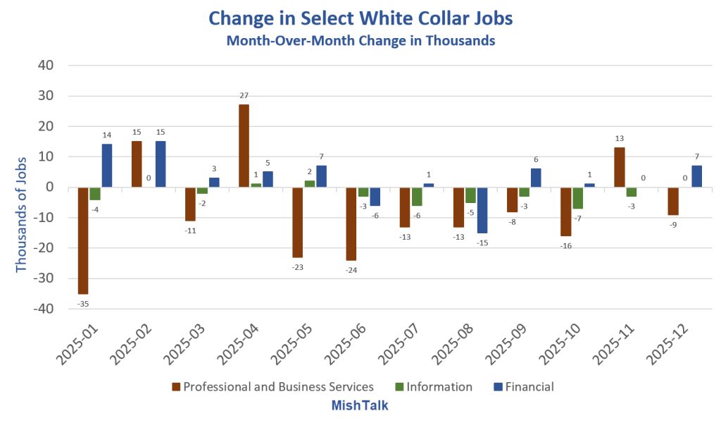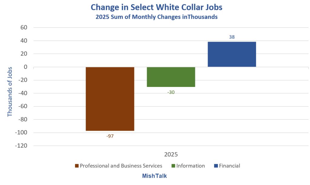 For the year, professional and business services lost 97,000 jobs. Information lost 30,000 jobs. Financial gained 38,000 jobs.