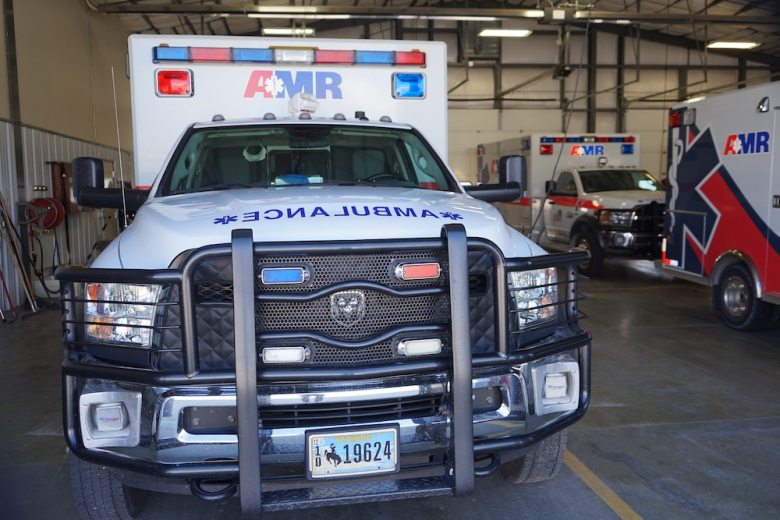 AMR ambulances in the ambulance bay in Lander. (Katie Klingsporn/WyoFile)
