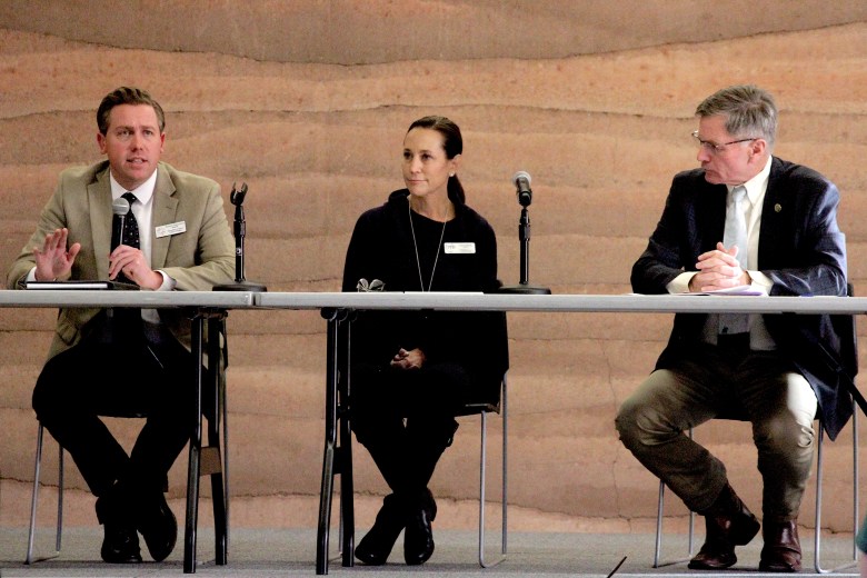 Wyoming Department of Health Director Stefan Johansson, Wyoming Department of Family Services Director Korin Schmidt and Gov. Mark Gordon led a Dec. 15, 2023 town hall-style meeting in Pinedale focused on Wyoming’s mental health challenges and resources. (Mike Koshmrl/WyoFile)