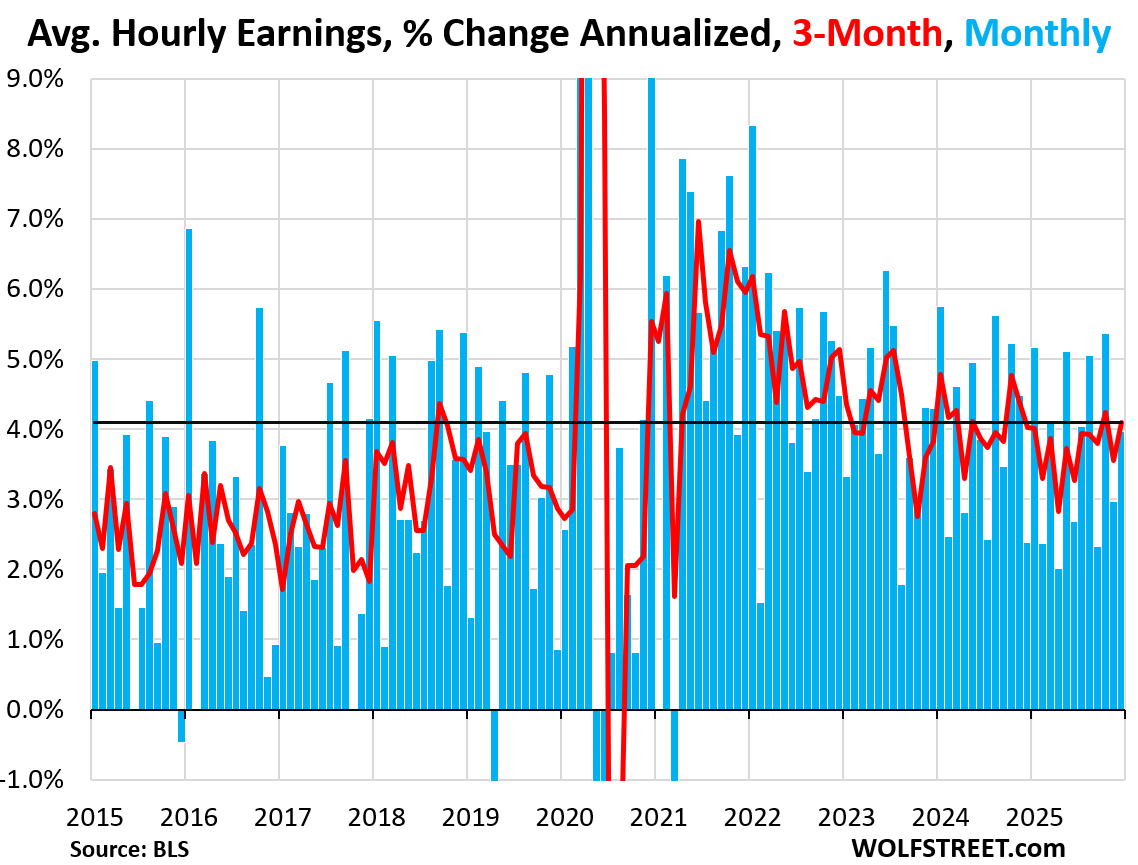 Three-month average hourly earnings rose by 4.1% annualized, at the top end of the 12-month range (red line):