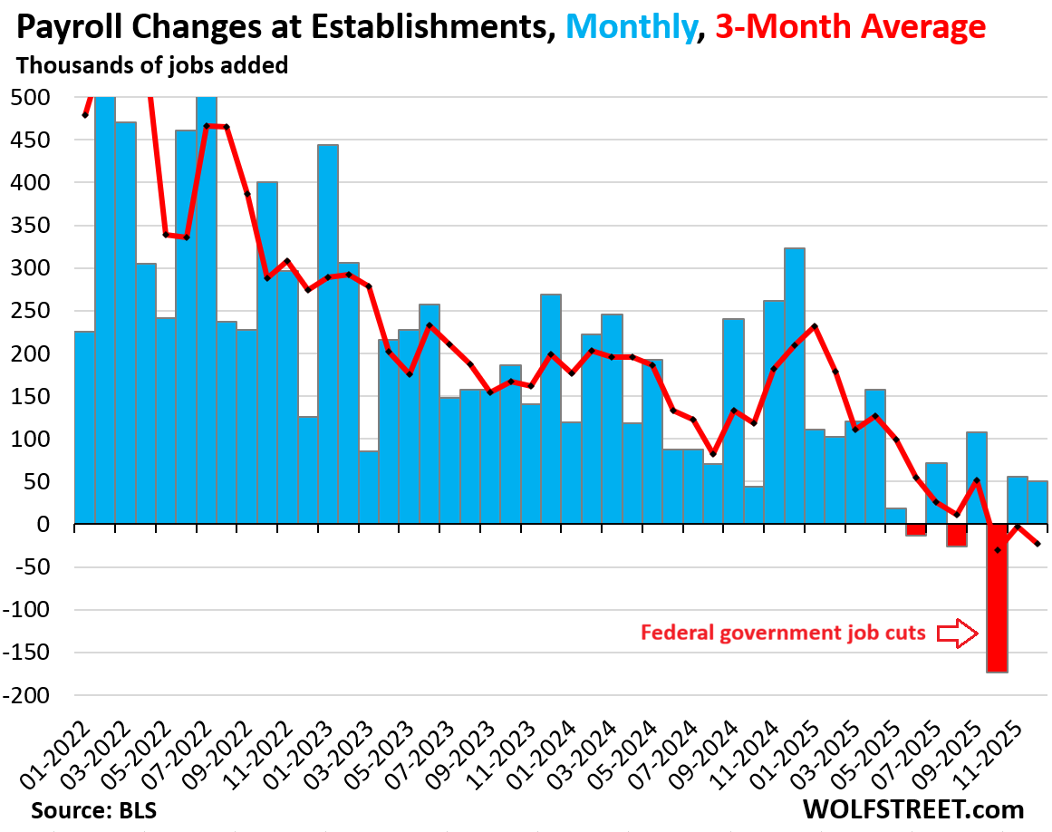 The job losses at the federal government and at state governments have hit nonfarm employment all year, and hard. In 2025, the federal government shed 264,000 jobs, and state governments shed 47,000 jobs, combined 311,000 jobs, according to the Bureau of Labor Statistics today.