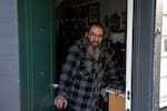 Patrick Herrington, who scrubbed blood off of the sidewalk outside his apartment, poses for a portrait in his apartment.