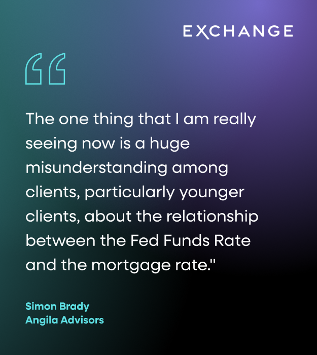 Brady: And just one more comment on the current market environment: The one thing that I am really seeing now is a huge misunderstanding among clients, particularly younger clients, about the relationship between the Fed Funds Rate and the mortgage rate. You know, there’s easily a world where the Fed can keep cutting and cutting and cutting and mortgage rates move higher. I mean, we saw that in 2024. I think a lot of people haven’t quite grasped this. They overestimate the correlation between what they hear that the Fed is doing and what they’re going to be paying on their mortgage or car loan. That’s one thing that I think I’m seeing more and more of.