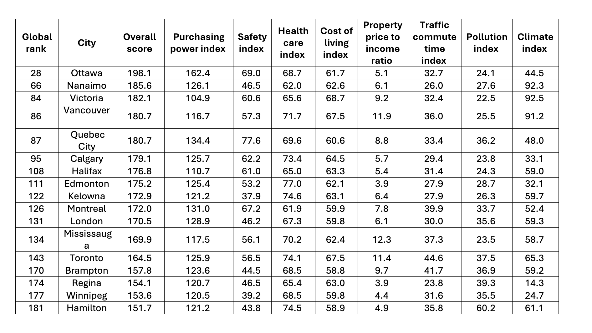 To contrast, here’s how the top five cities last year did in 2026 when compared against other Canadian cities in Numbeo’s ranking: