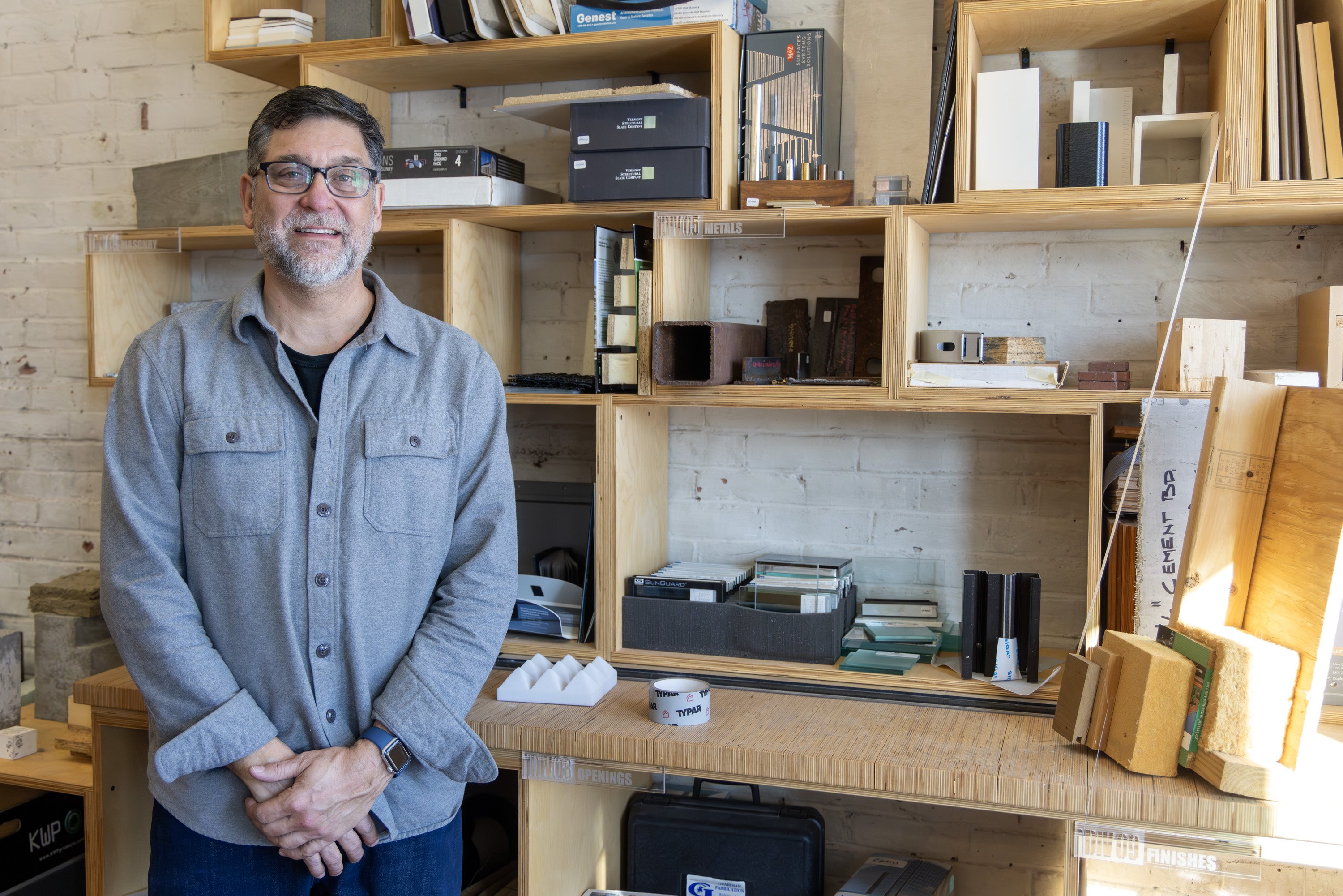 Eric Stark, a professor of architecture at the University of Maine at Augusta, stands in front of the material library in Handley Hall on Thursday. The library gives students a sense of available materials, from stone and slate to wall systems. (Anna Chadwick/Staff Photographer)