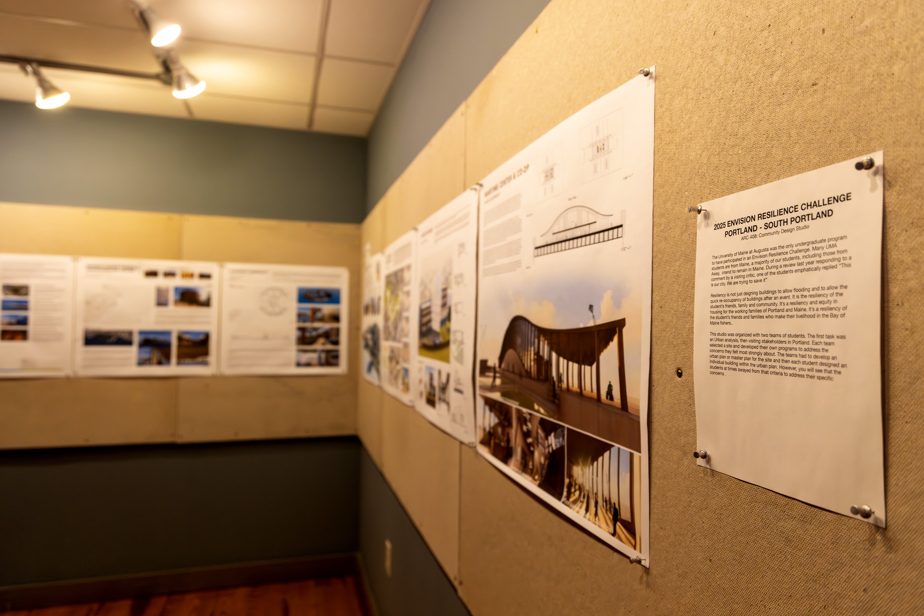Printouts from the 2025 Envision Resilience Challenge in South Portland are seen Thursday on a floor of Handley Hall, which houses the University of Maine at Augusta architecture program. This year, students are working on a project in Bath. (Anna Chadwick/Staff Photographer)