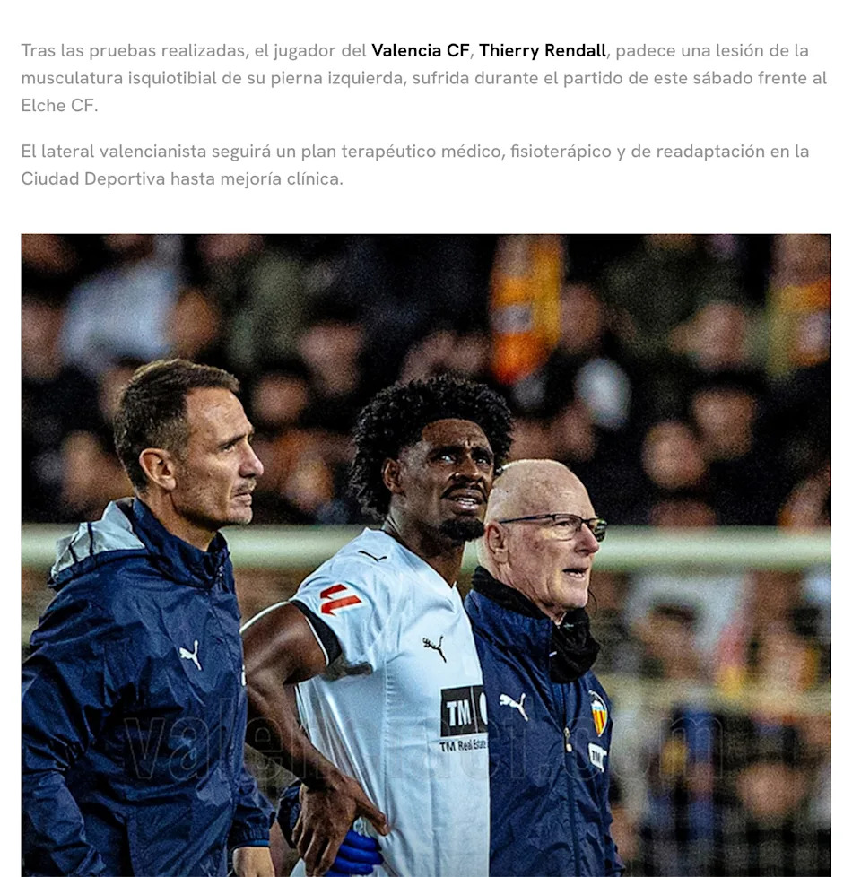 The draw against Elche was not the only bad news for Valencia, as their full-back Thierry Rendall had to leave the field due to injury, and a medical report has already been released.