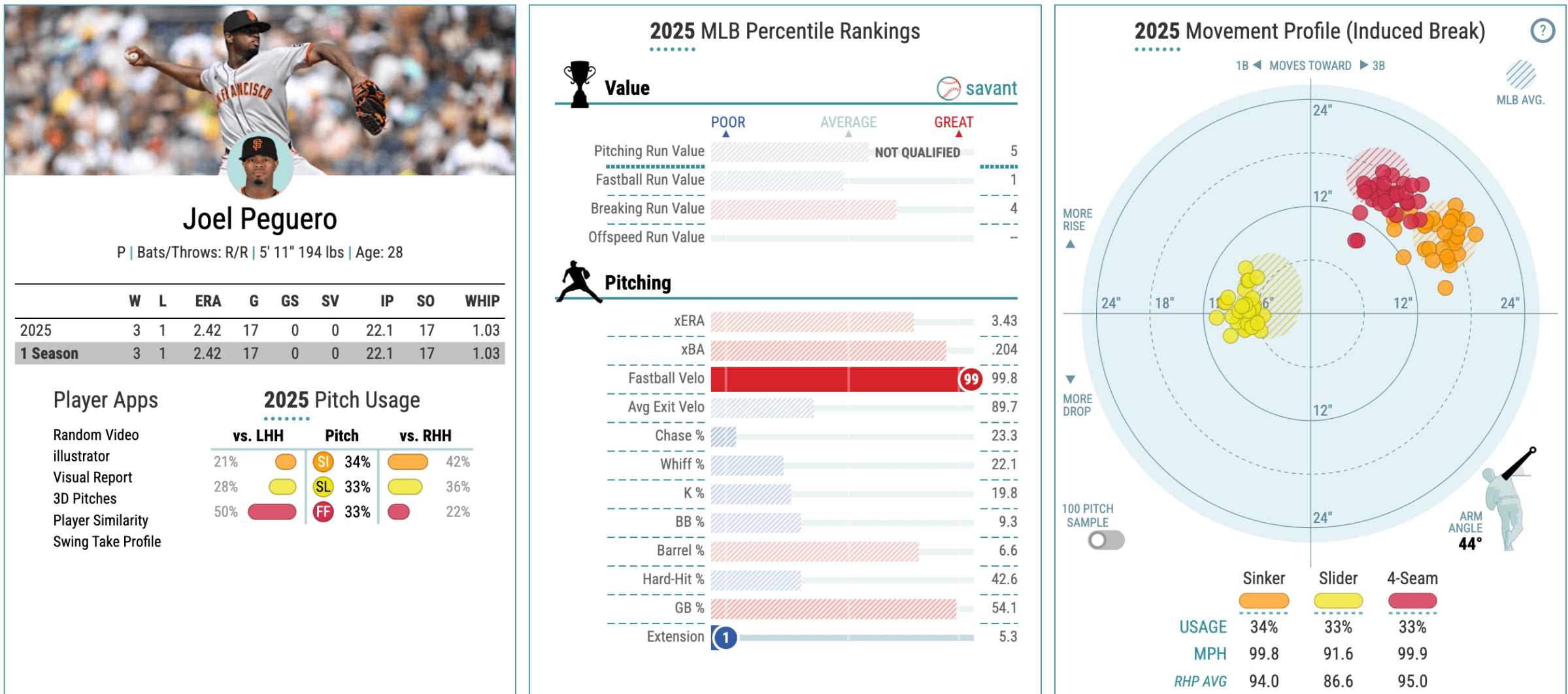 Whether we like it or not, Peguero appears in line to fill a high-leverage set-up role for the 7th or 8th innings in support of Ryan Walker in the 9th. God-forbid, Walker loses his closer role again, Peguero ostensibly has the stuff to be the back-up plan. He’s the classic hard-throwing closer that slams the door in the 9th. On paper, his profile is a perfect match for the role — but the game ain’t played on paper. Questions and concerns abound about his performance, not to mention his level of experience. General command and his historically high walk rate is certainly a hang-up. He isn’t Tyler Rogers either, so the higher contact rate coupled with the higher hard-hit rate isn’t ideal. His 7 K/9 won’t cut it either, especially if he wants to be the guy to break the team out of mid-inning jams. Which brings me to the four-seamer — it’s obviously speedy, but speed in this league ain’t the silver bullet it used to be. Its movement is kind of flat too, which makes it easier for hitters to square up — especially if it’s poorly located. Then there’s the three pitch mix itself. Is it too one-note? Does he need something offspeed, or maybe a cutter with a different velocity, to keep hitters more off balanced?