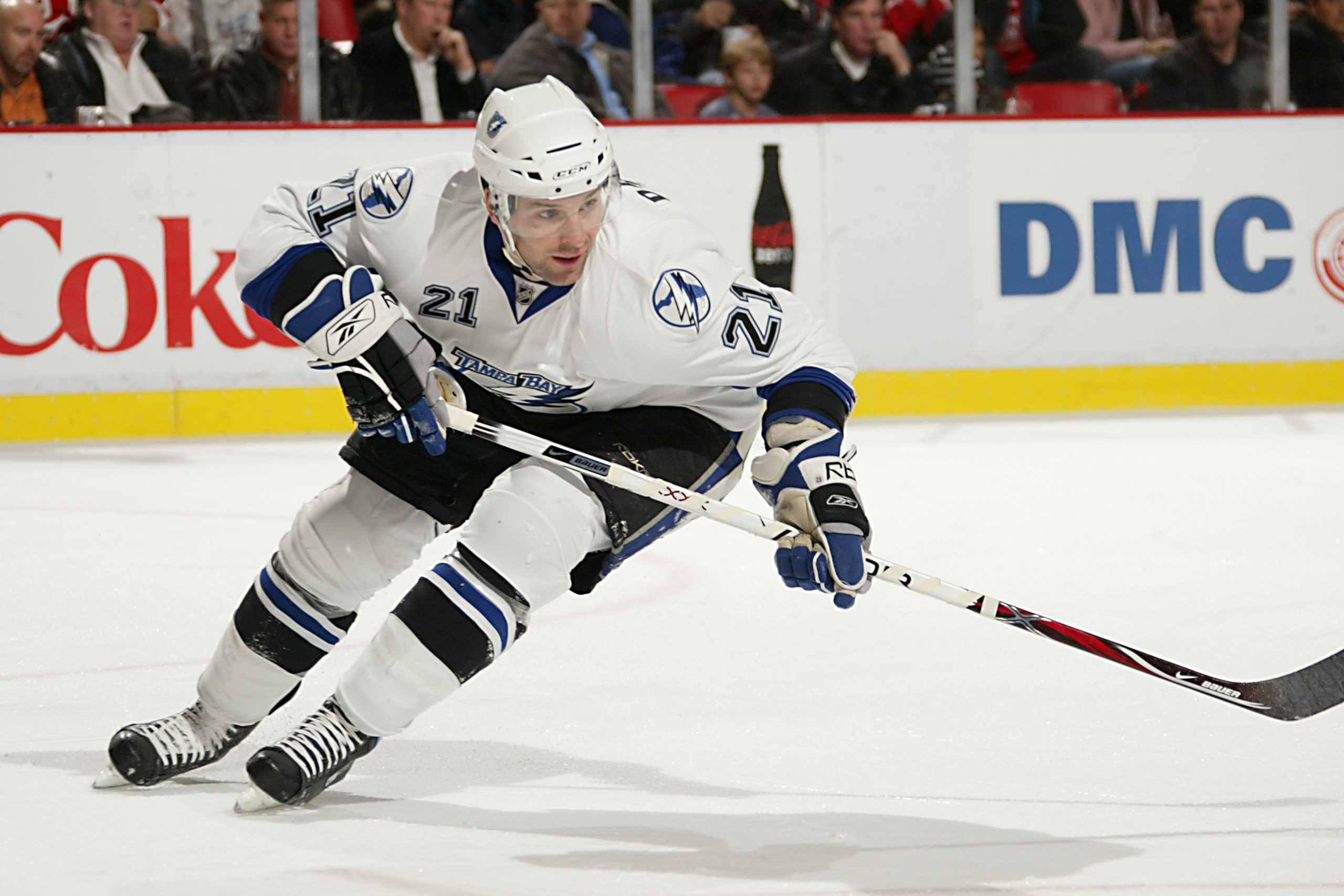 Mathieu Darche skates for the Lightning in a 2007 game against the Detroit Red Wings at the Joe Louis Arena. (Dave Sandford / Getty Images)