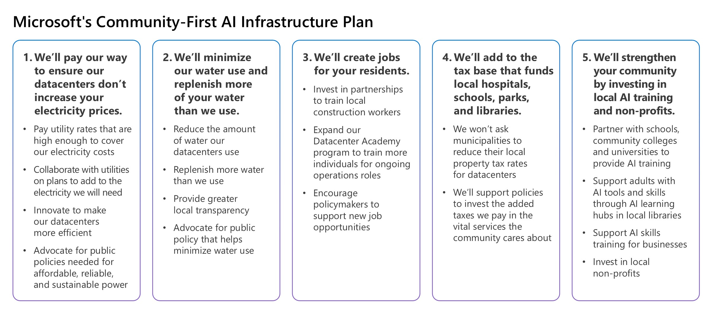 This Community-First AI Infrastructure Initiative provides a framework for doing exactly that. It is anchored in five commitments, each a clear promise to the communities where we build, own, and operate Microsoft datacenters. These are: