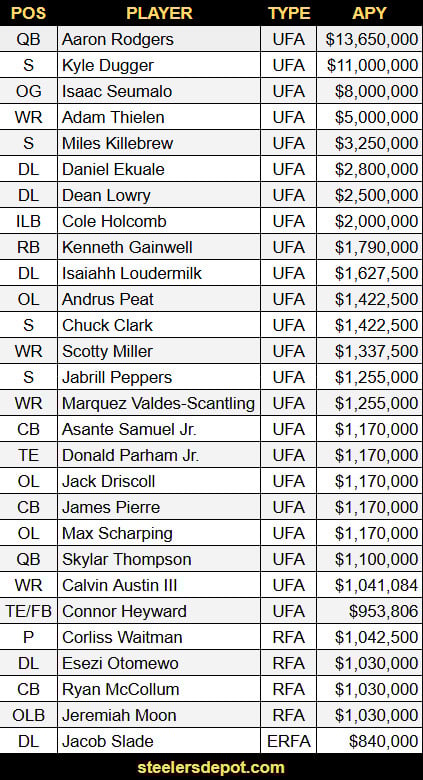 The priciest options, based on current APY, come with Rodgers, Dugger, Seumalo and Thielen. It’s possible that three of those four players could retire, and we will see what happens with Dugger. DeShon Elliott’s return makes him less necessary, though they need to continue adding safety depth one way or another.