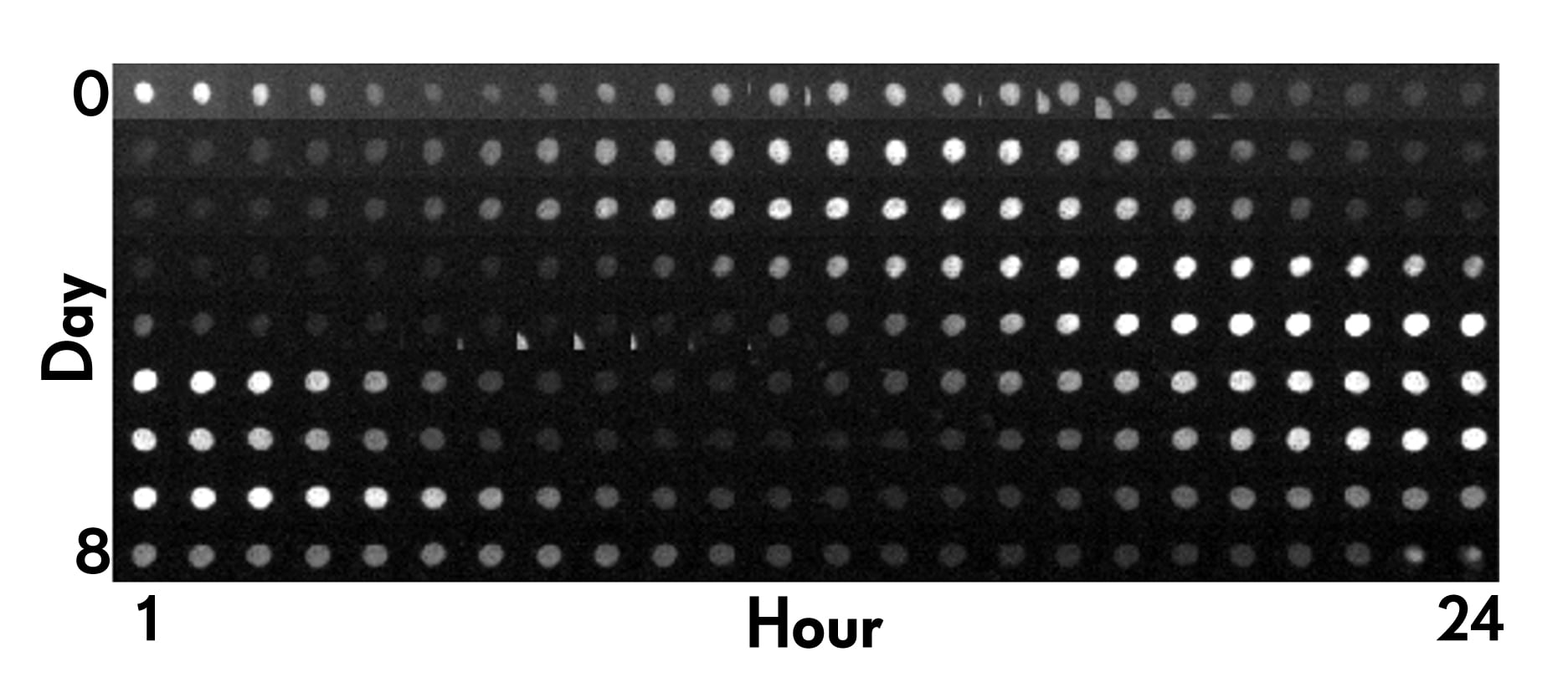 The Weizmann scientists’ CircaSCOPE uses an array of human cells, each representing a different time of day, resembling a wall lined with clocks showing the current time in major cities around the world.