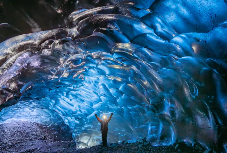 “Ice Cave Hiker in Blue Magic” by John Seivert