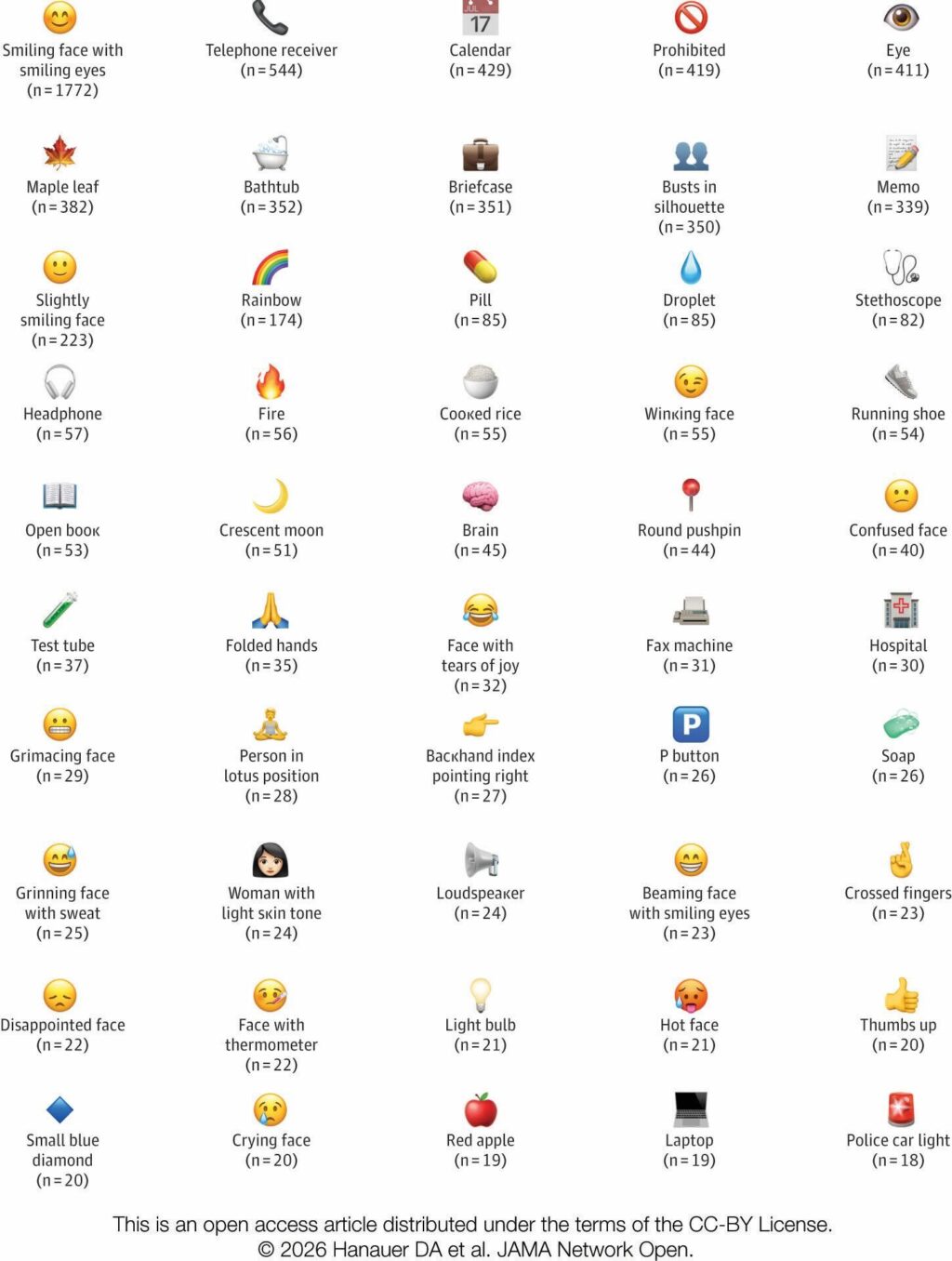 The top 50 emoji found in Michigan Medicine’s electronic health records.Hanauer DA et al/JAMA Network Open