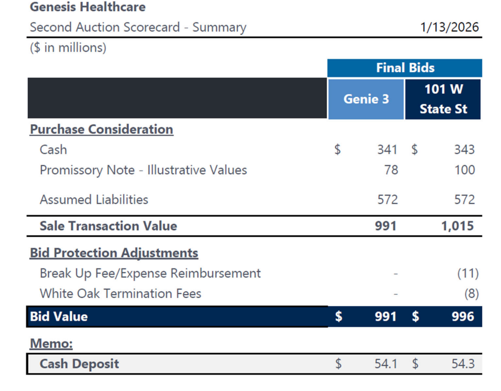 Genie 3 submitted a $991 million bid, while 101 West State Street’s winning offer of $1.015 billion included total bid-protection adjustments of $17 million, as outlined in the court filing. The winning bid also consisted of $343 million in cash, a $100 million promissory note, and the assumption of $572 million in liabilities.