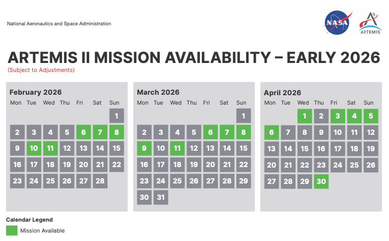 NASA has announced 16 launch windows between February and March for the Artemis II mission, the first crewed flight of the Artemis program.