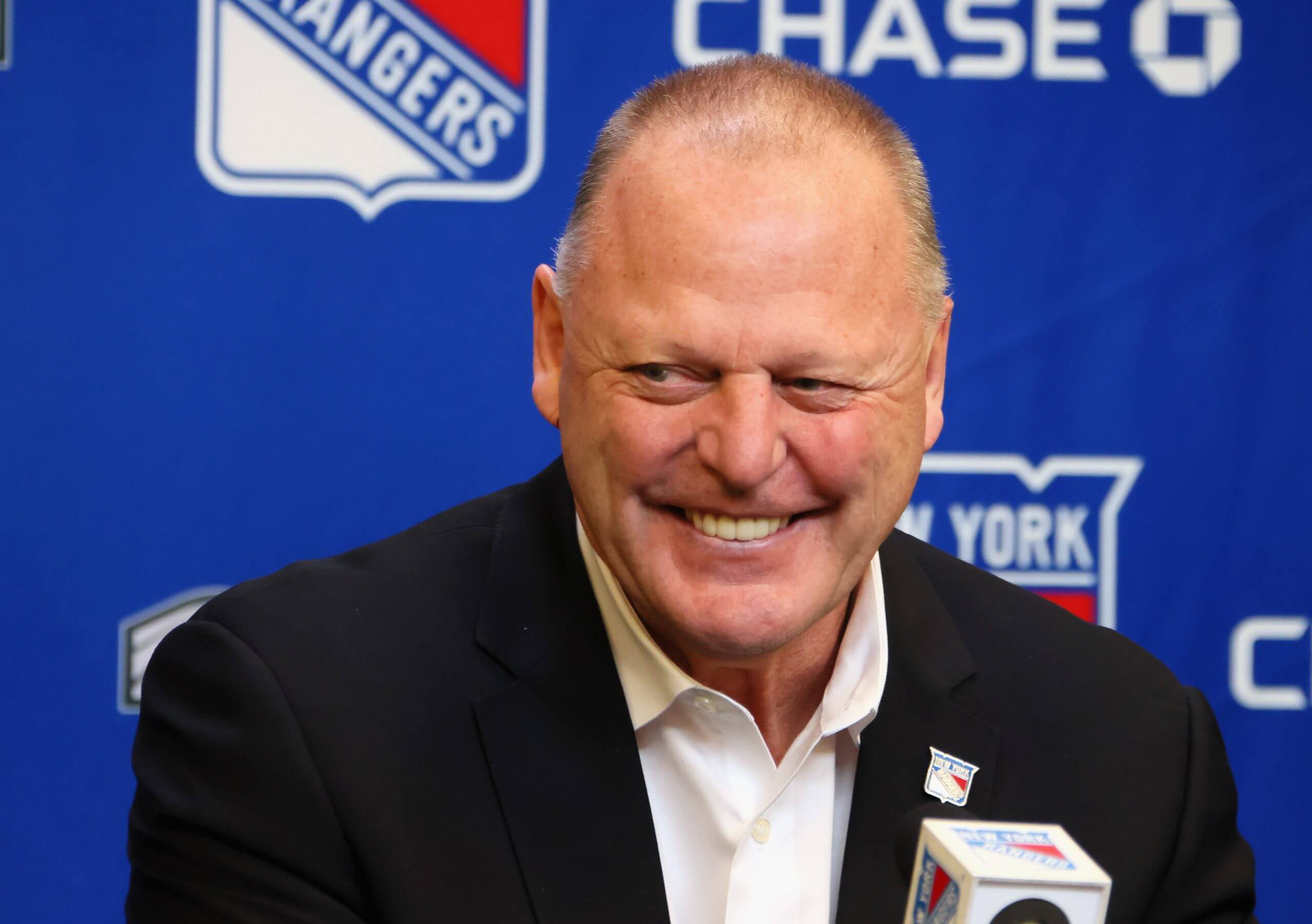 Gerard Gallant smiles in front of a Rangers backdrop.