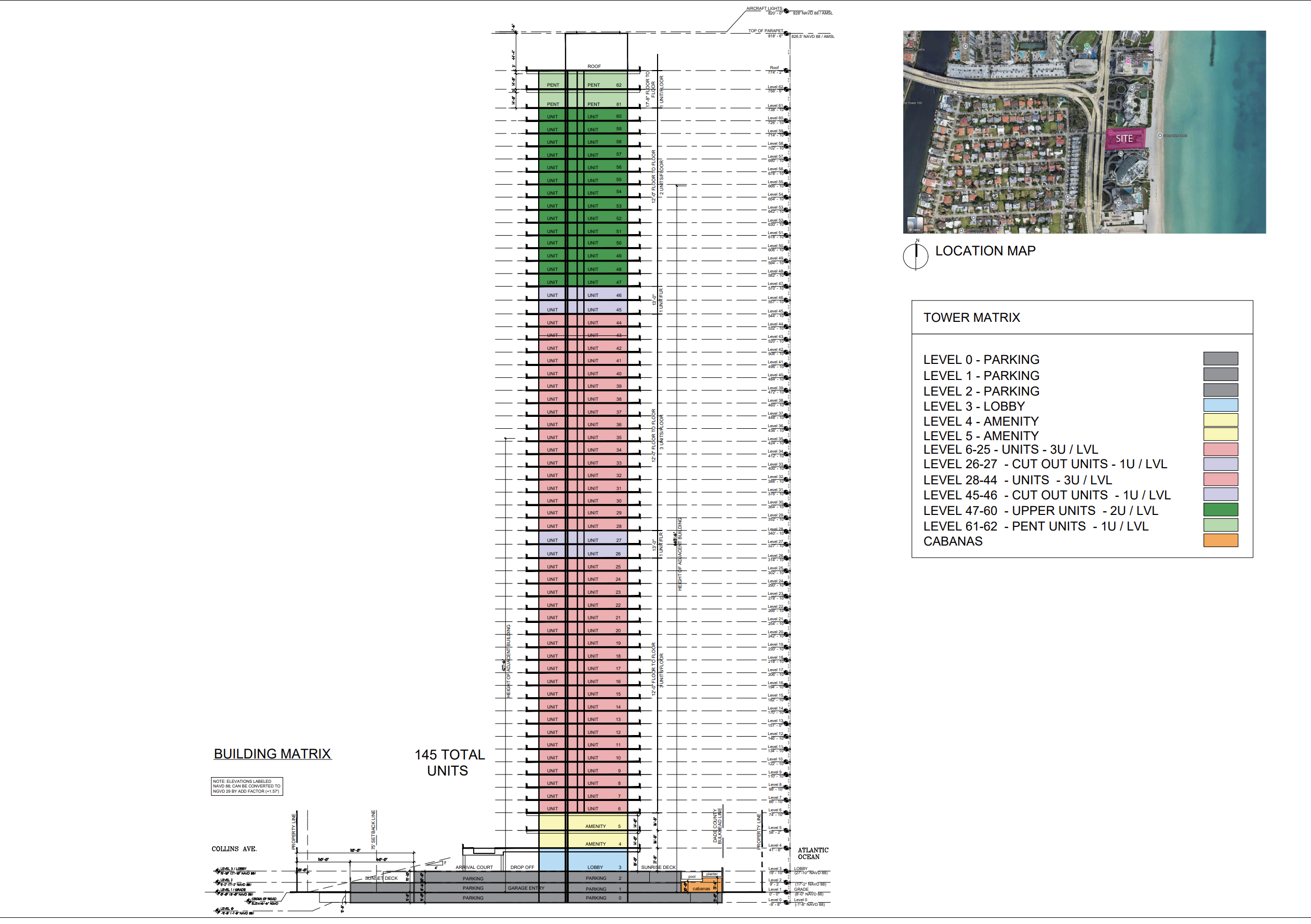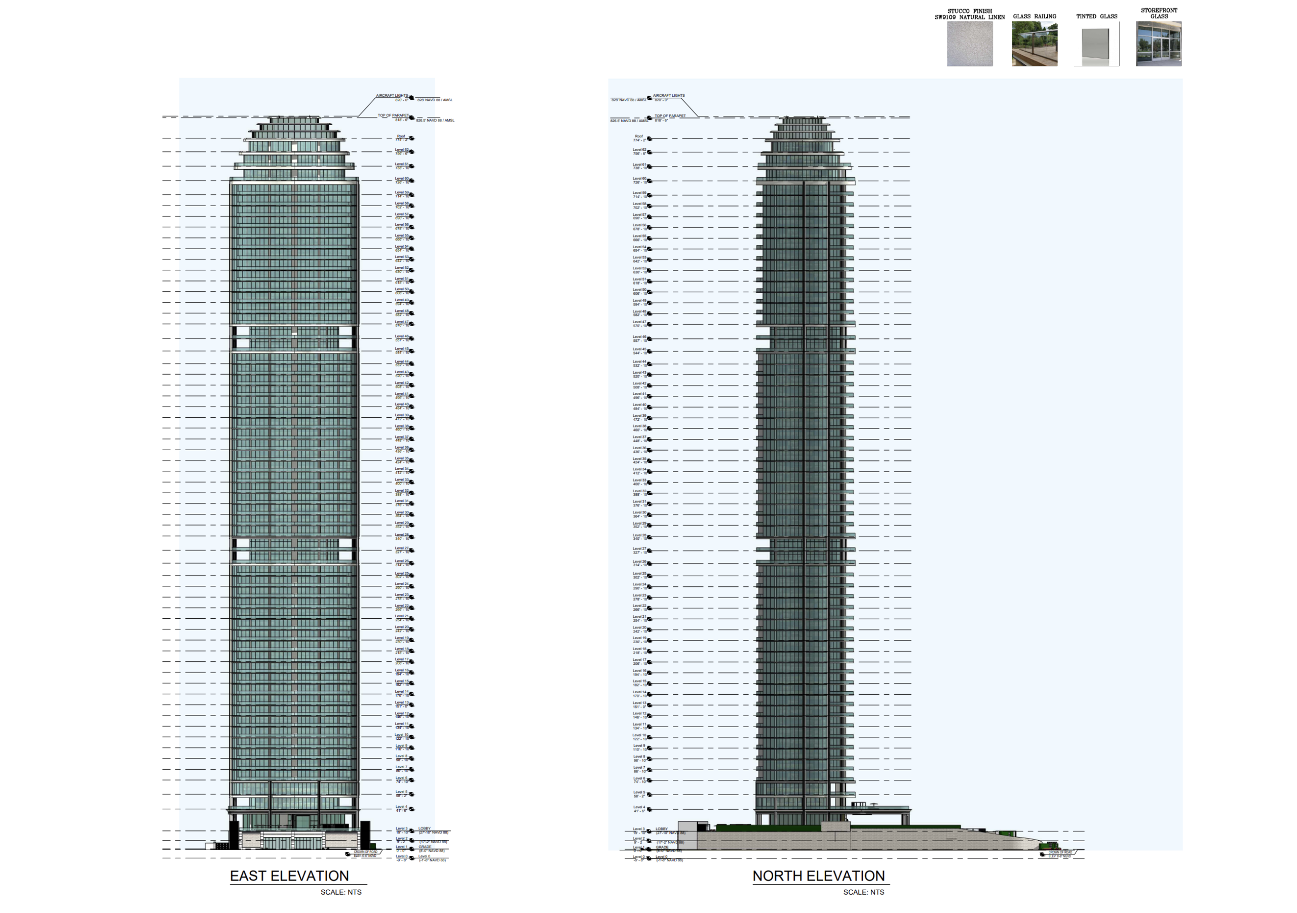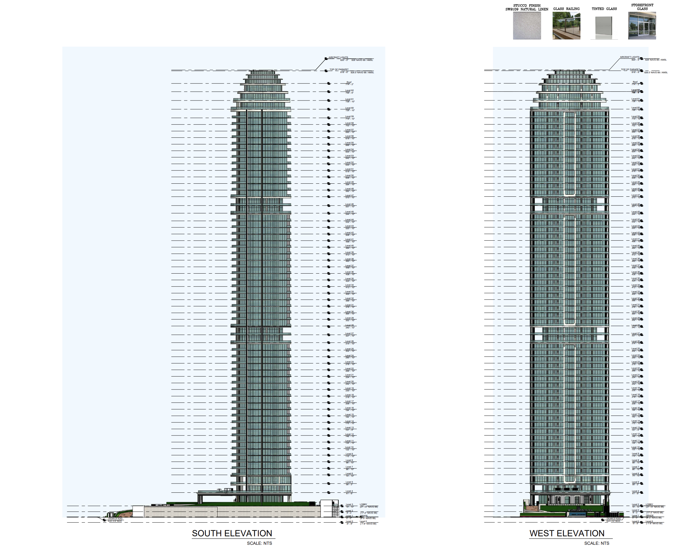 Height data included in the application outline several vertical reference points measured above ground level. The primary occupied rooftop level is shown at approximately 774 feet, while the top of parapet is indicated at roughly 819 feet. The highest point of the structure, where FAA-required aircraft warning lights would be located, is approximately 820 feet above ground. The FAA has approved the project for a maximum height of up to 828 feet. At its proposed height, the tower would exceed the 672-foot Estates at Acqualina and the 750-foot St. Regis Residences currently under construction, becoming the tallest building in Sunny Isles Beach.